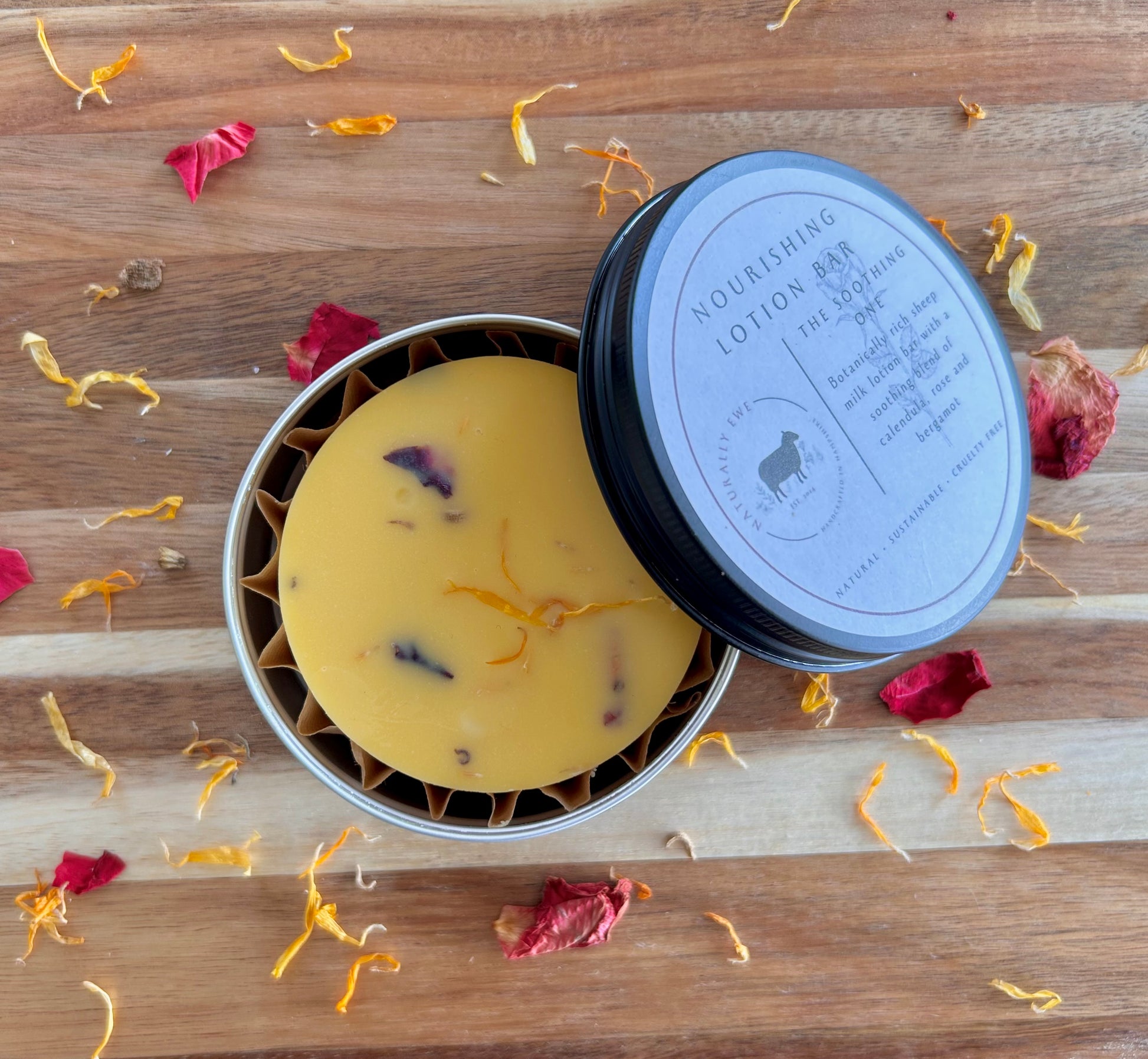 Deeply nourishing, natural solid lotion bars. A hydrating blend of Beeswax, Olive Oil and Shea Butter with protein rich Sheep Milk and pure essential oils. The perfect mess free moisturiser for the whole body or specific dry areas such as hands, feet, elbows or knees. Being a solid compact, they are ideal for travelling or keeping in your bag for on the go hydration.