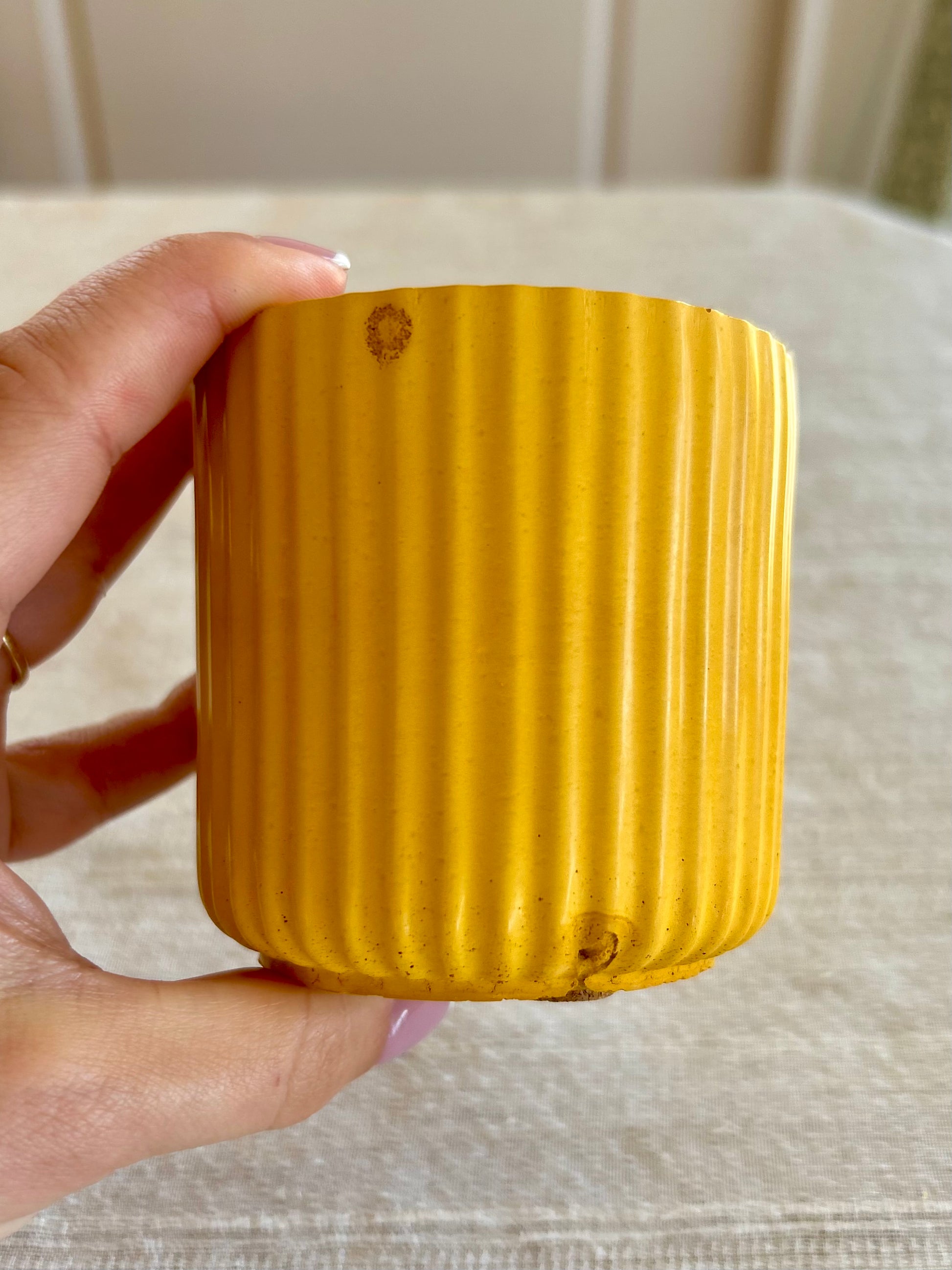 This ribbed candle jar in colour mustard has 2 blemishes on one side - one at the top of the jar and one at the bottom. Fortunately, they’re both on one side which means if positioned to the back of a shelf or mantelpiece it will not be noticeable at all! Please see first picture for blemishes and second picture for how it looks from the other direction.