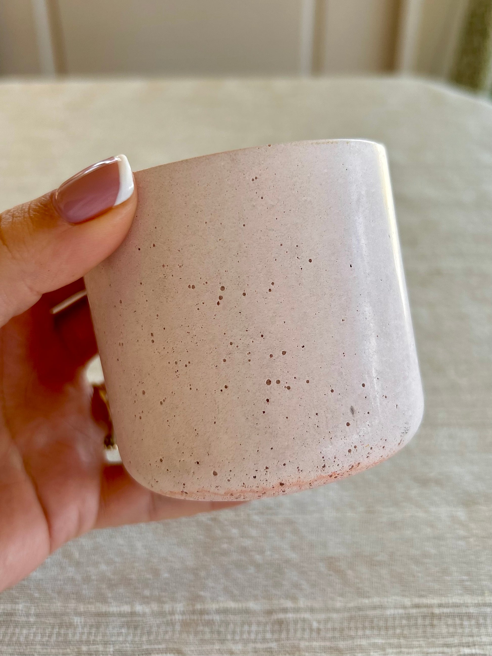 This smooth candle jar in colour Blossom is paler in colour than the usual Blossom range. There are also small air bubbles around the outside of the jar. These imperfections do not affect the use of the jar.