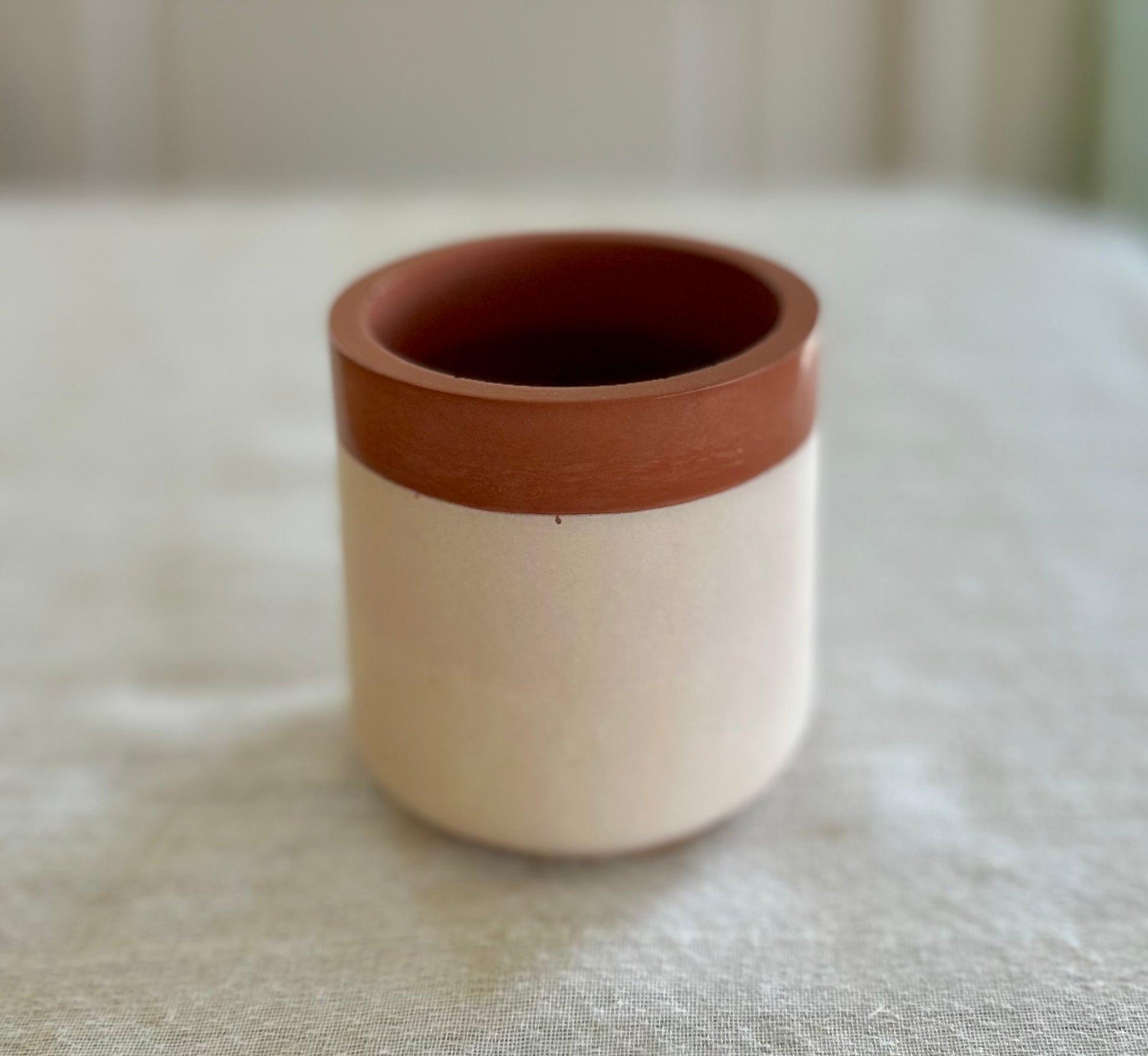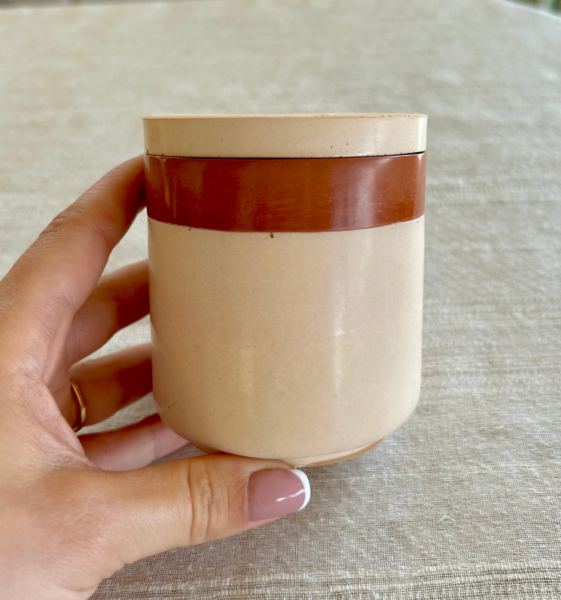 This smooth candle jar in colour Oat and Rust striped doesn’t have any specific imperfections. It’s been added to this collection due to the design being different from the other ranges. The stripe has been created using excess mixture from other batches - waste not want not!