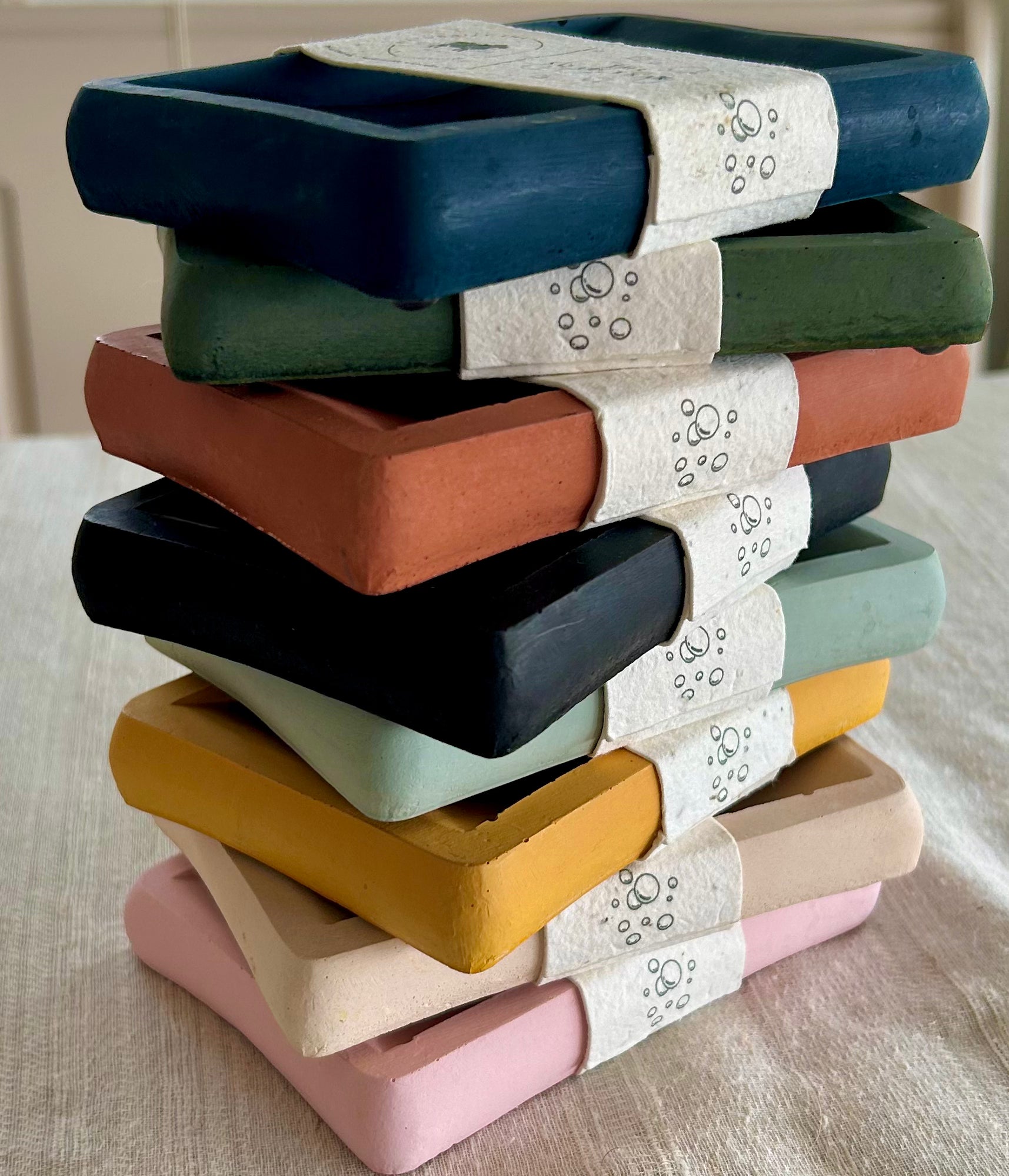 Each soap dish is made from Jesmonite which is an environmentally conscious alternative to traditional resin products. It is non toxic, contains no VOC’s and is safe to work with. Working in an environmentally conscious way is very important to Naturally Ewe – all of our packaging is recyclable or plantable as well as using all sustainable and environmentally friendly products and ingredients.