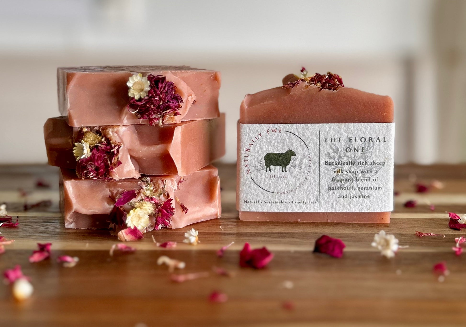 Botanically rich sheep milk soap with a fragrant blend of patchouli, geranium and jasmine