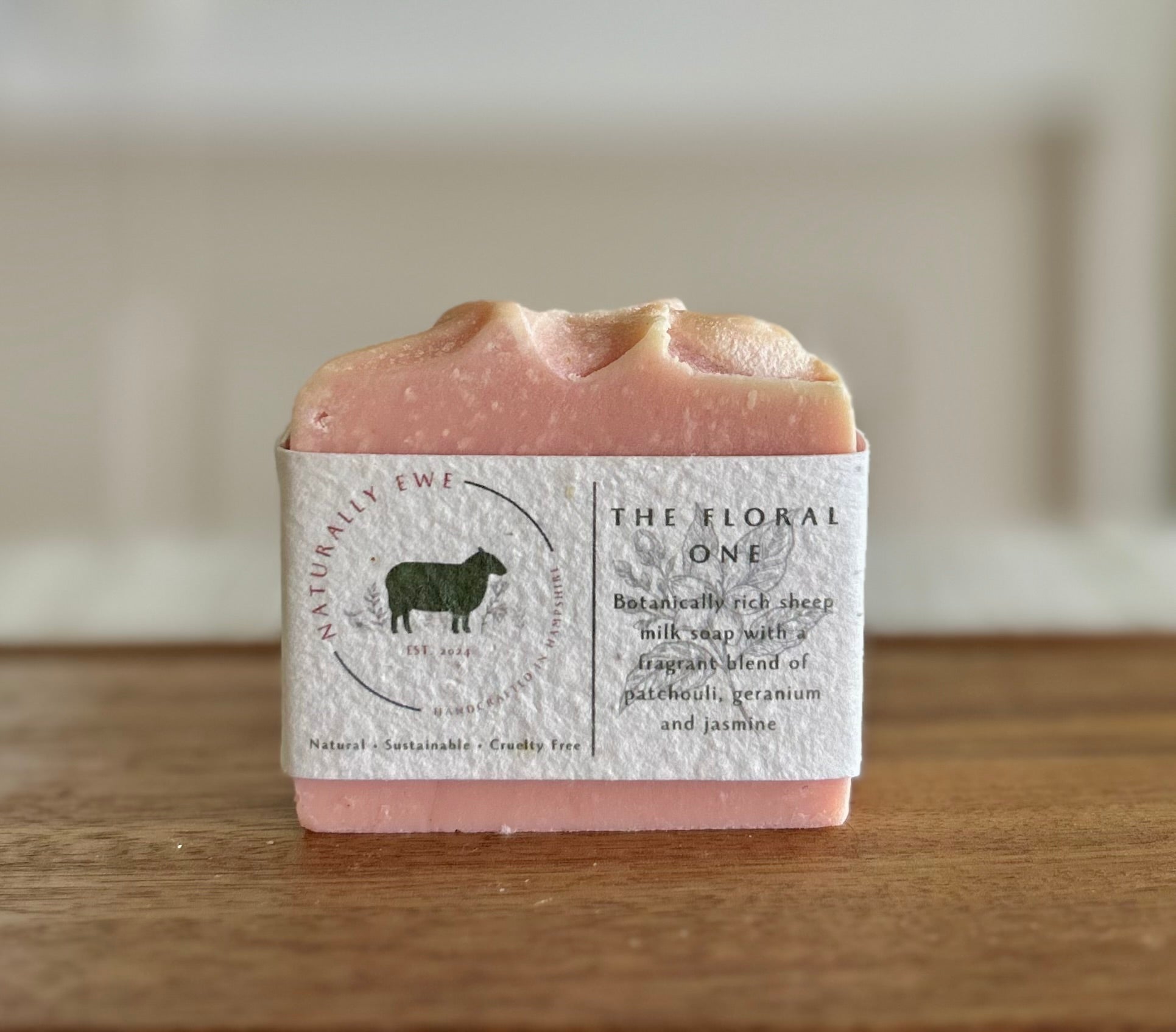 Botanically rich sheep milk soap with a fragrant blend of patchouli, geranium and jasmine. ‘Naked’ version without the botanicals on top.