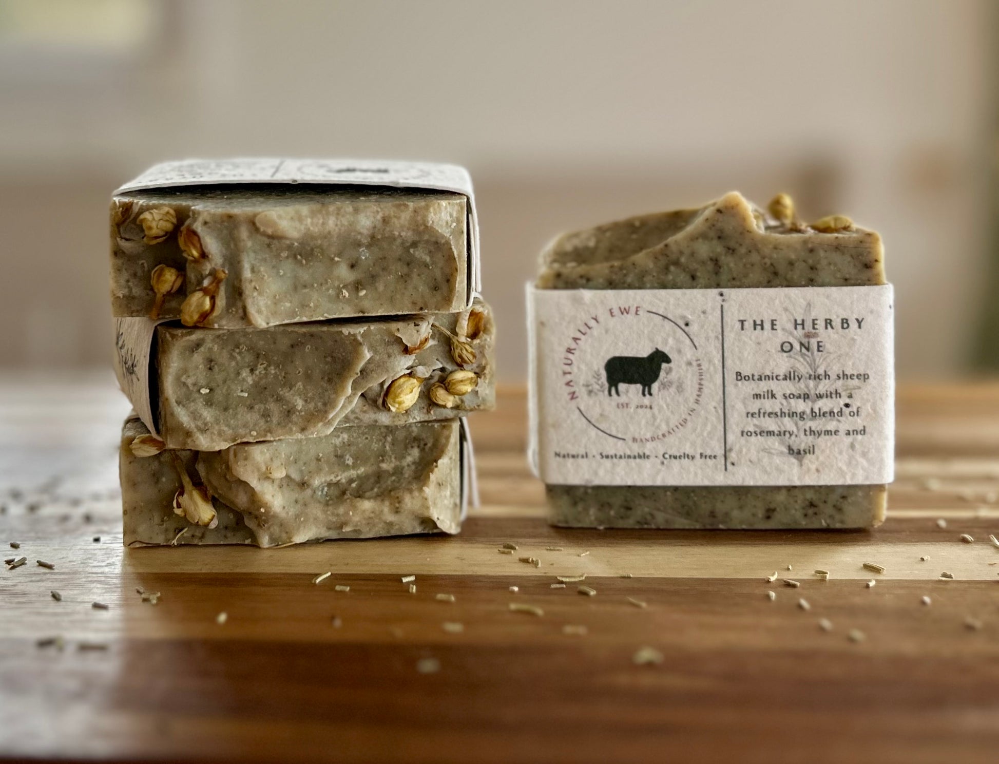 Botanically rich sheep milk soap with a refreshing blend of rosemary, thyme and basil