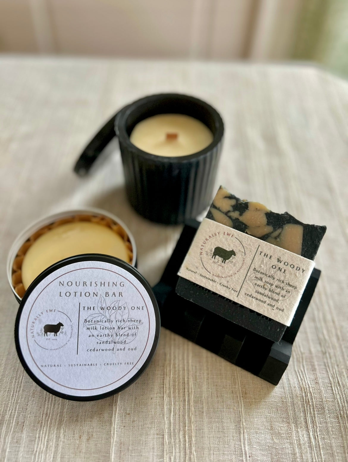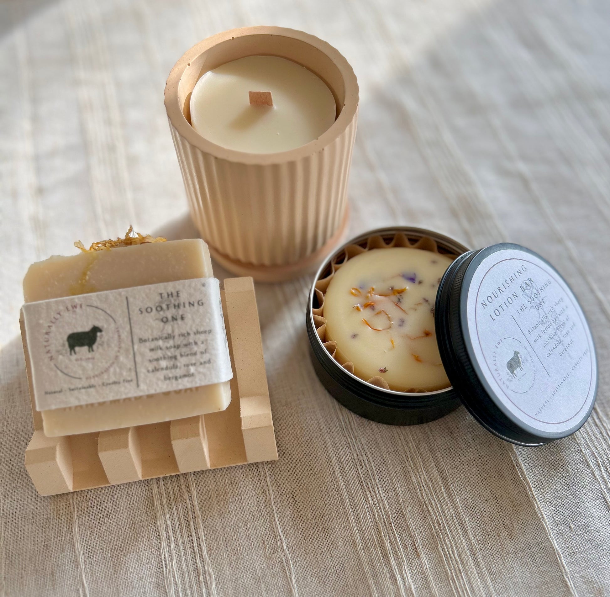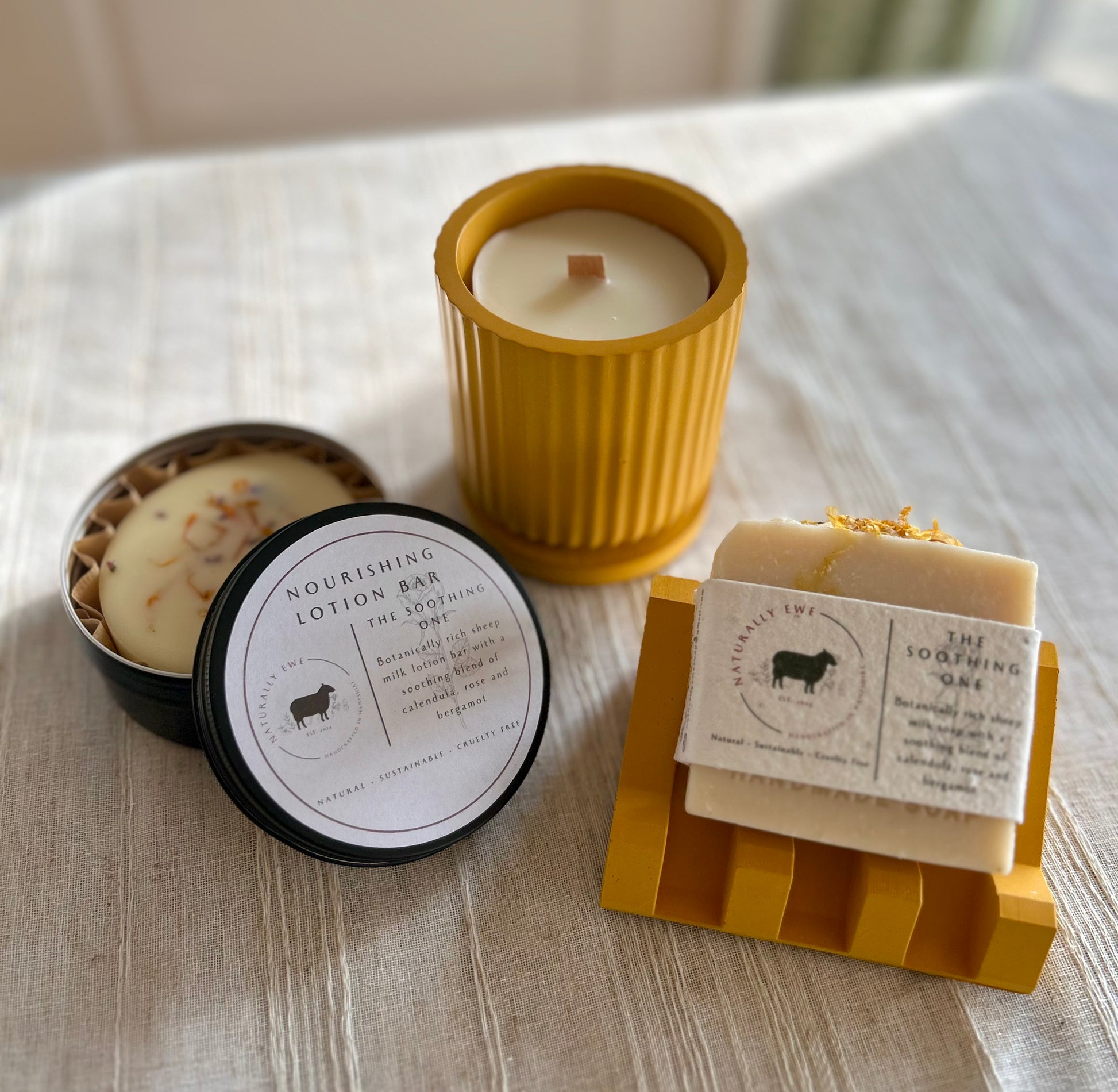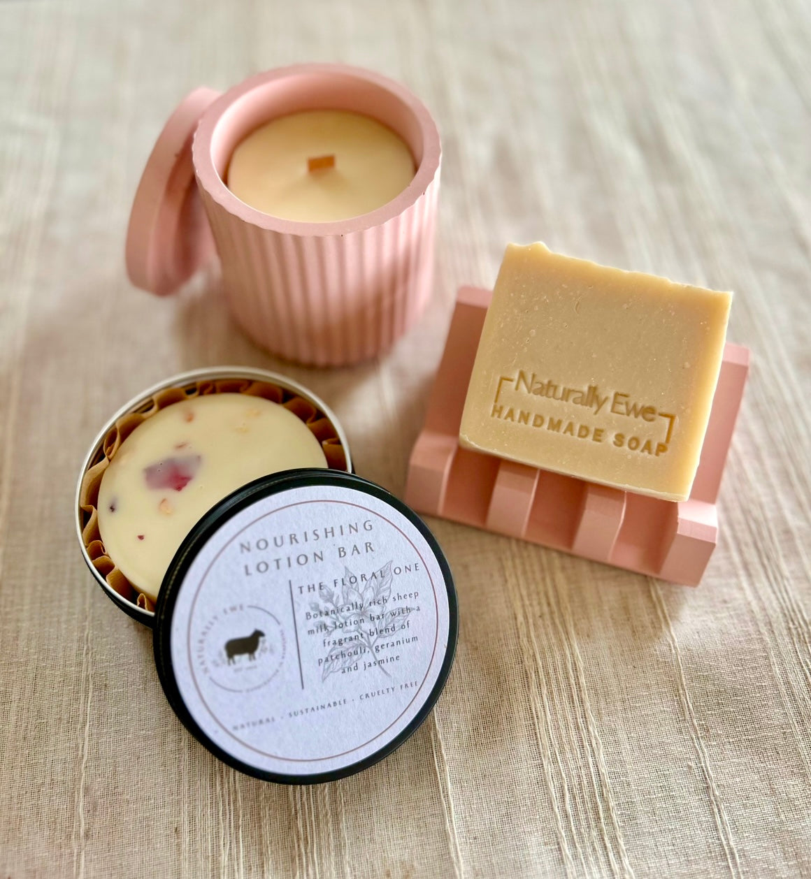 A luxurious Naturally Ewe collection including 1 botanically rich sheep milk soap bar, 1 refillable beeswax candle and 1 large nourishing lotion bar in your chosen fragrance as well as a candle jar and a soap stand in your choice of colour.