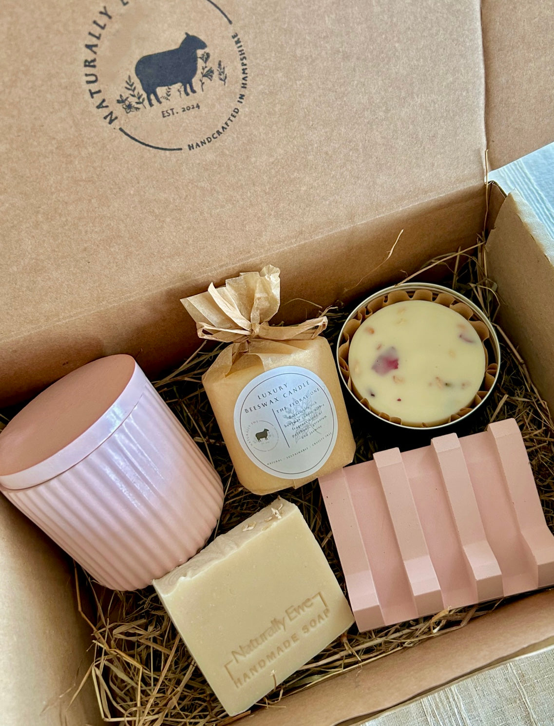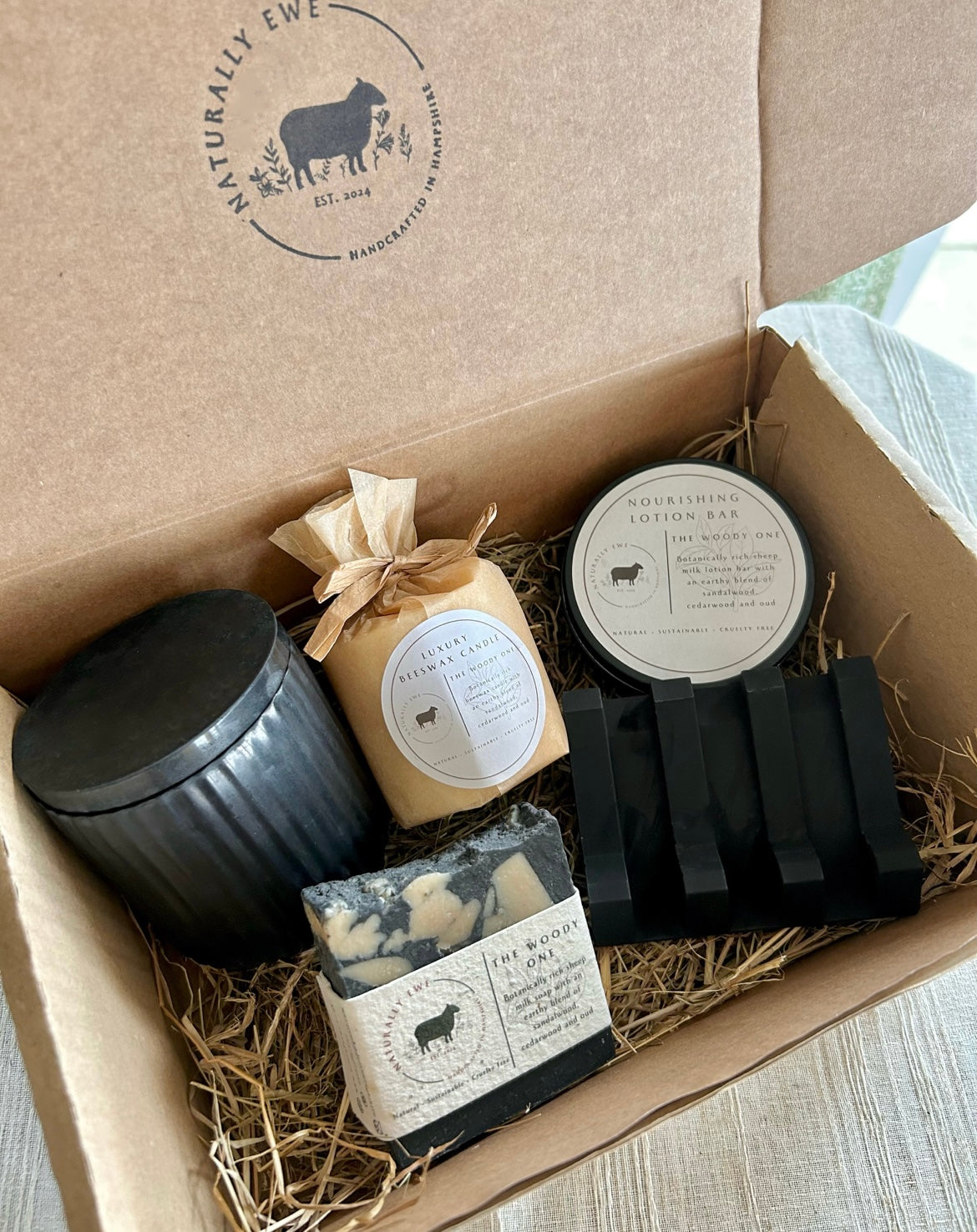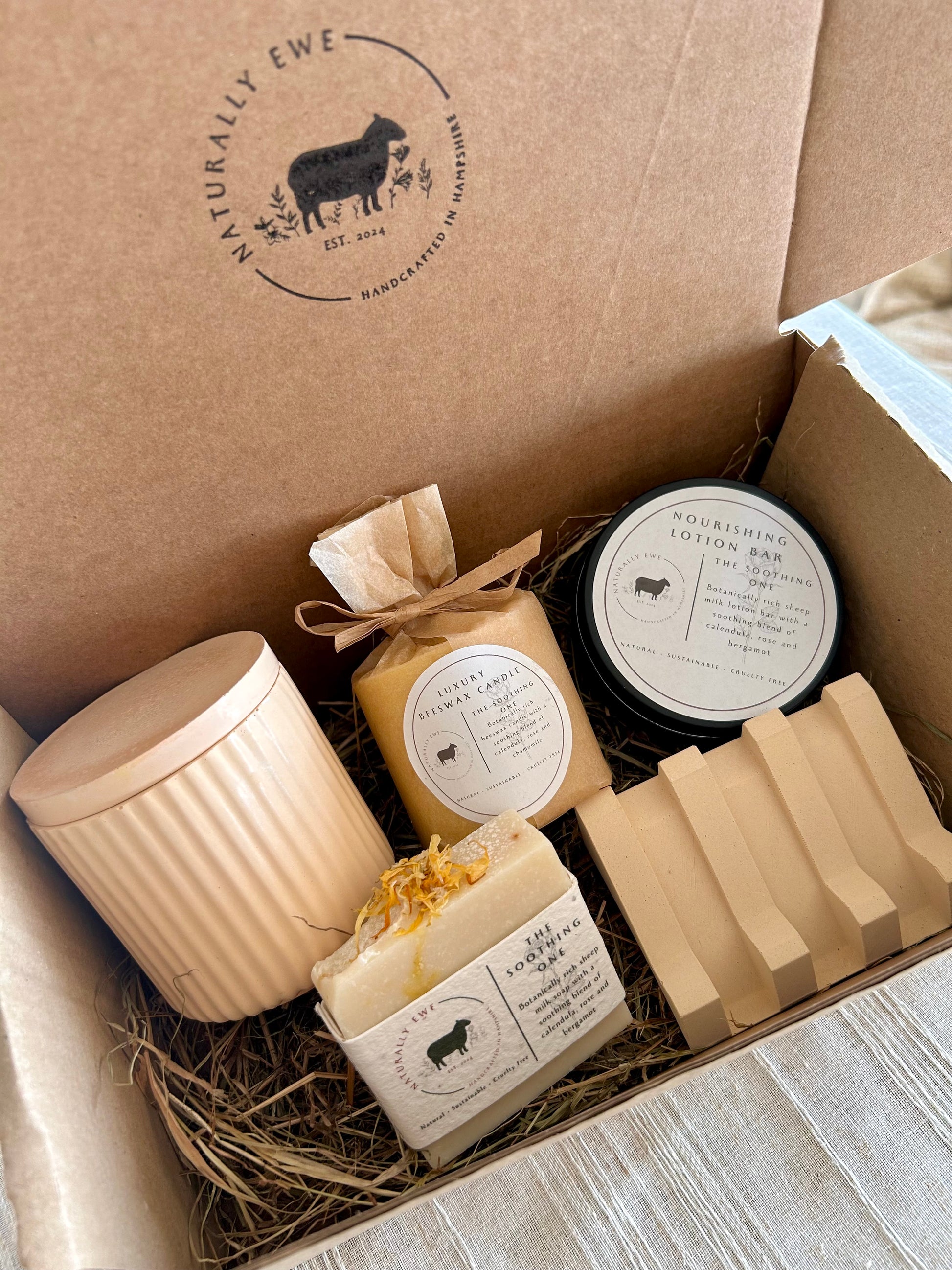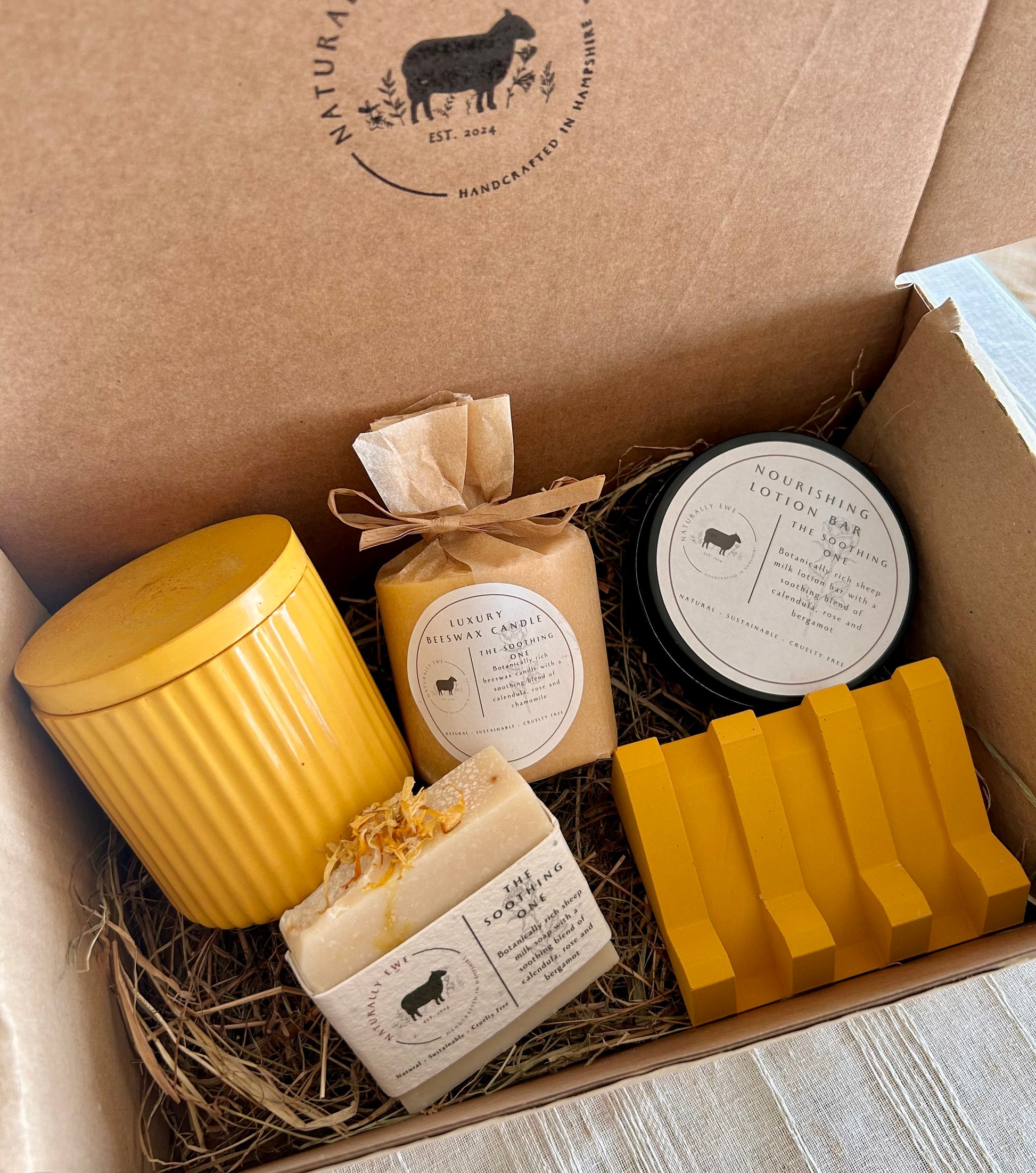 A luxurious Naturally Ewe collection including 1 botanically rich sheep milk soap bar, 1 refillable beeswax candle and 1 large nourishing lotion bar in your chosen fragrance as well as a candle jar and a soap stand in your choice of colour.