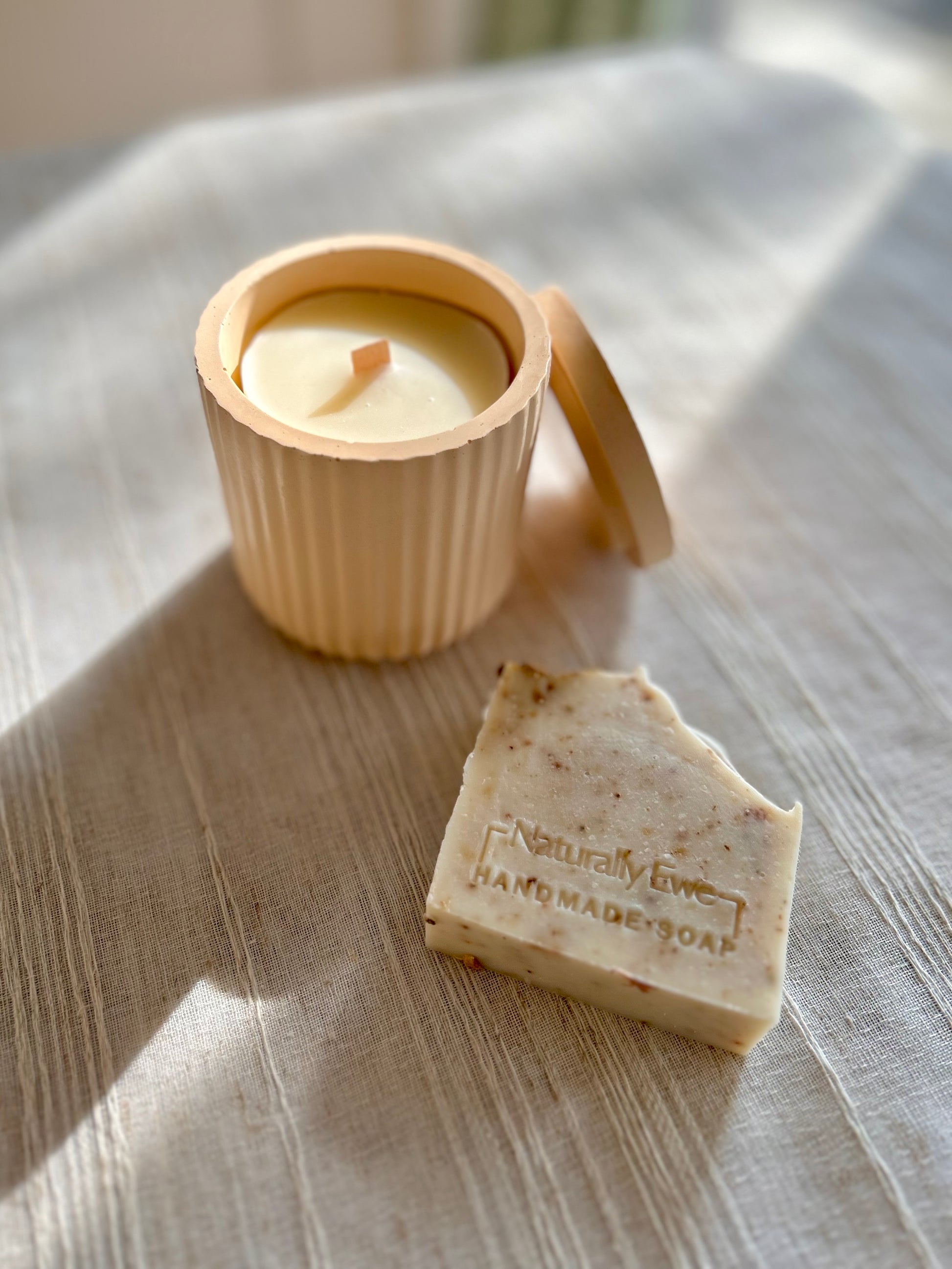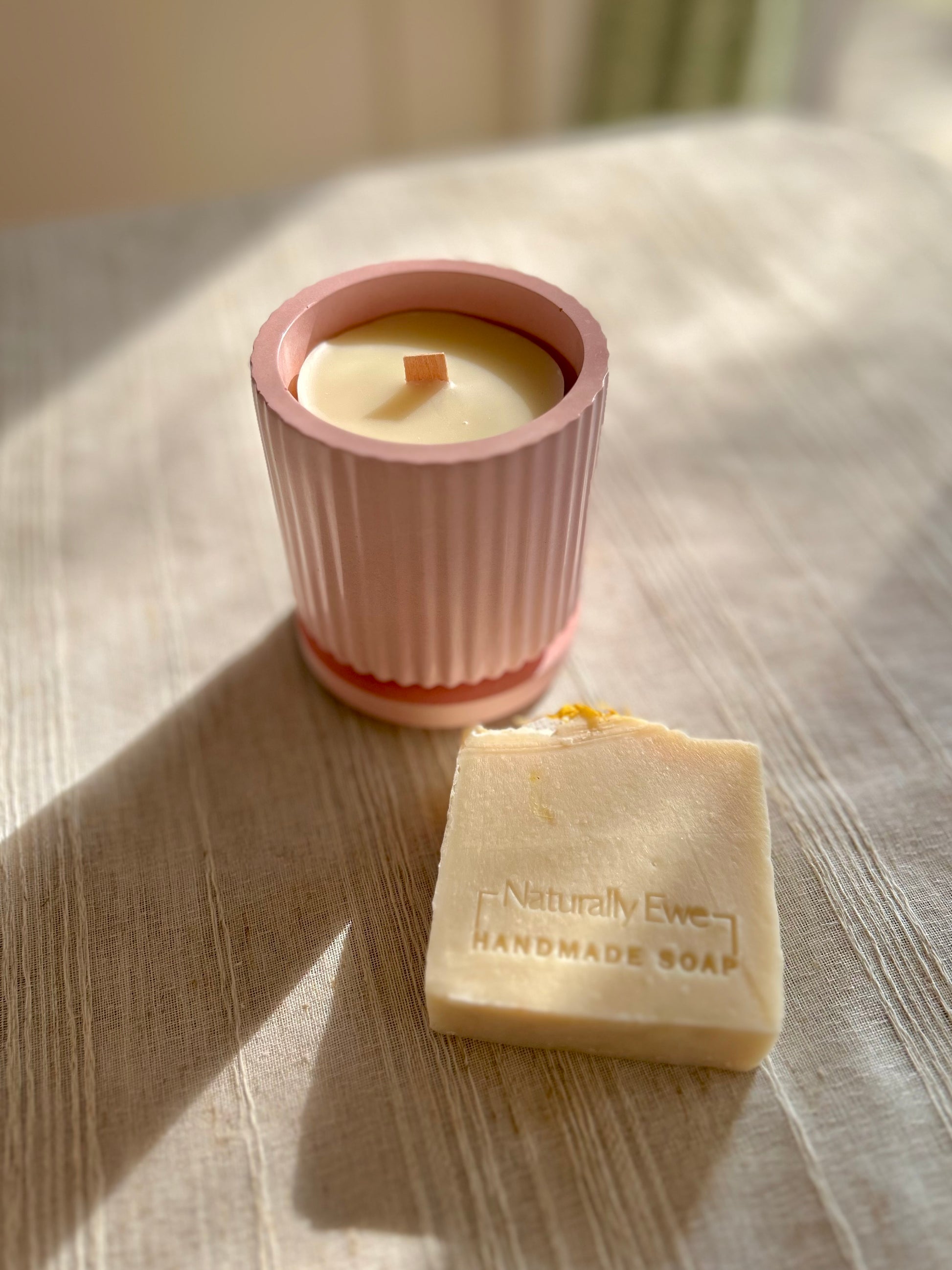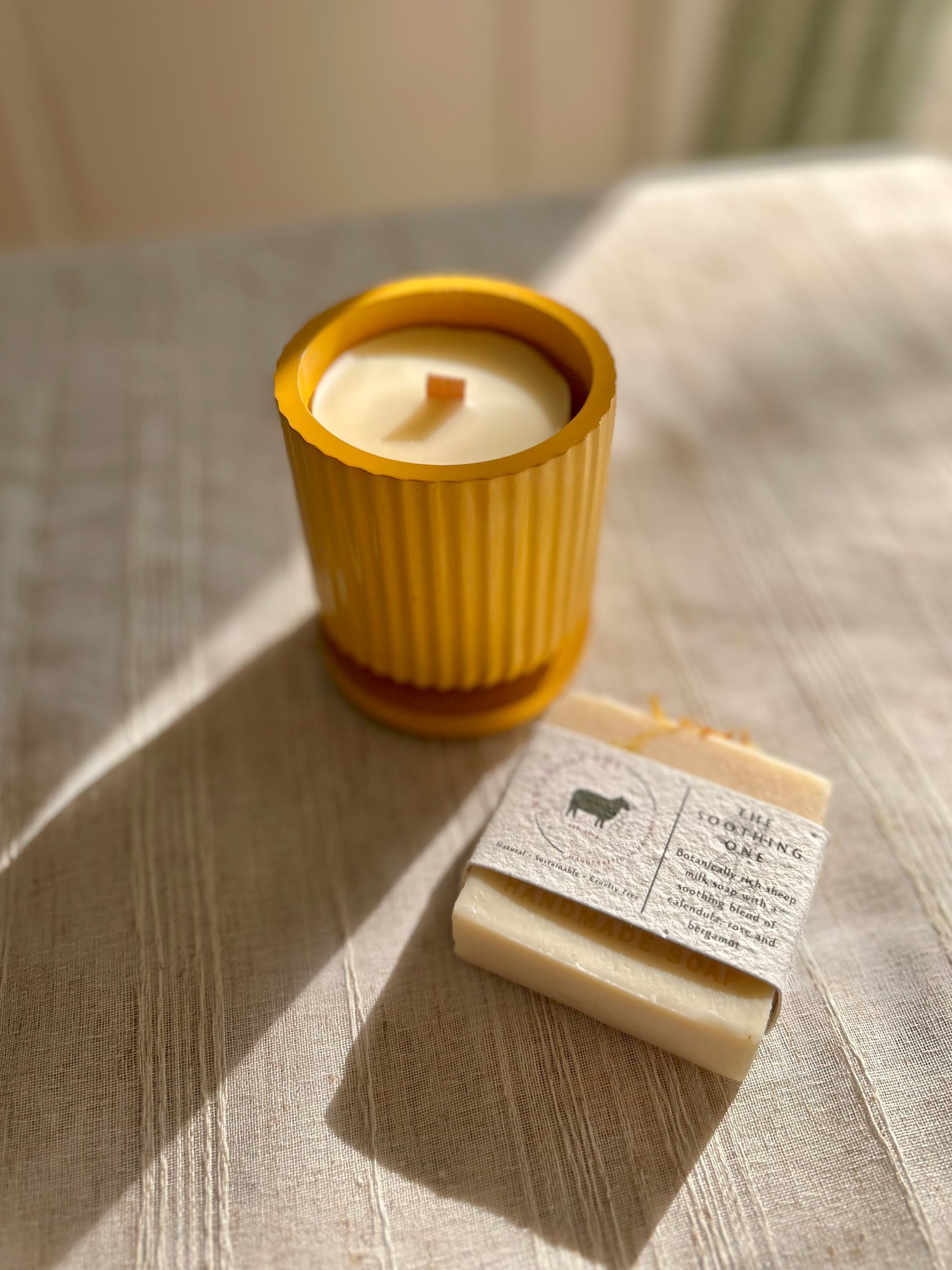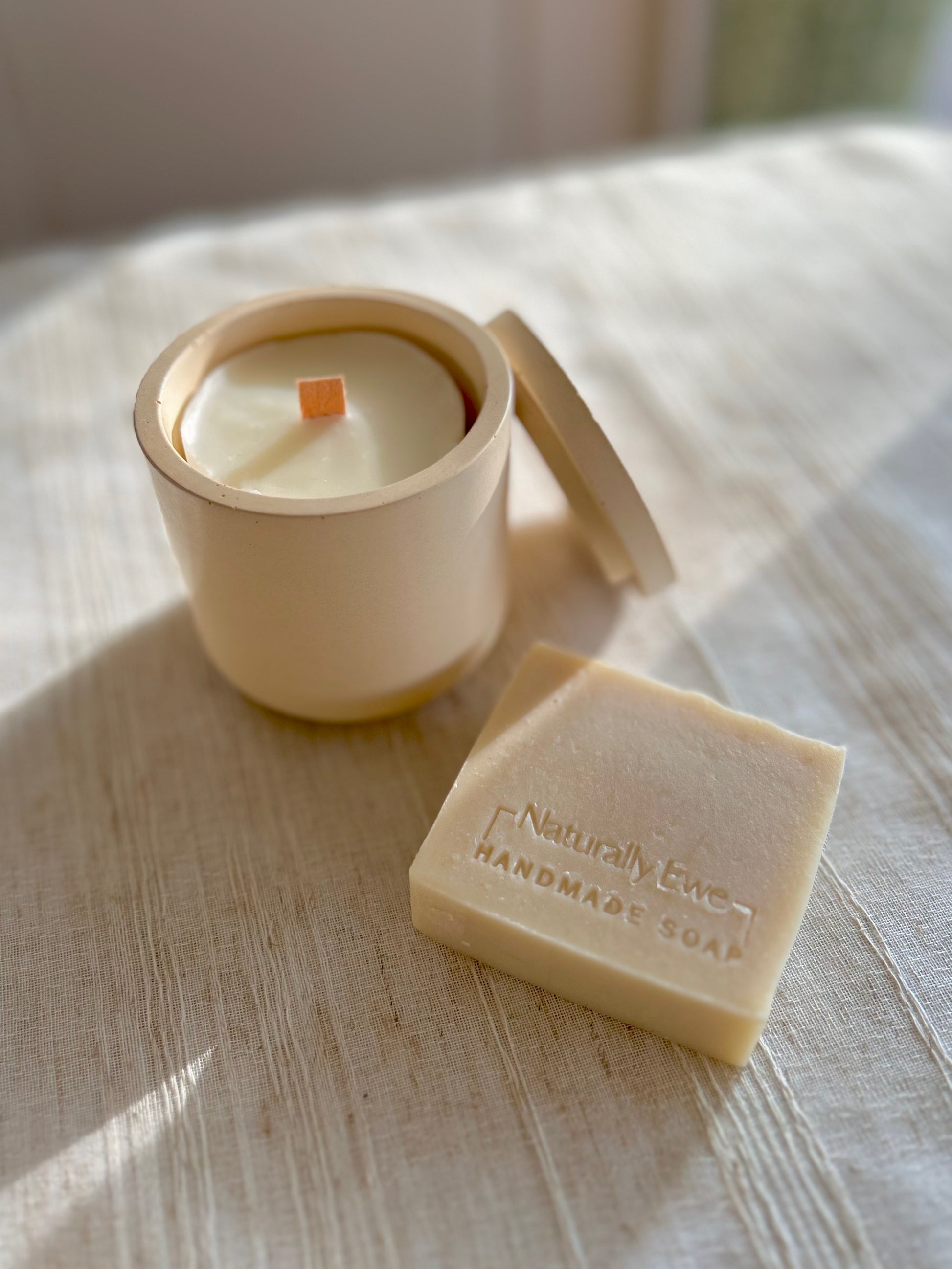 The perfect start up collection including 1 botanically rich sheep milk soap bar and 1 refillable beeswax candle in your chosen fragrance as well as a candle jar in your choice of colour.
