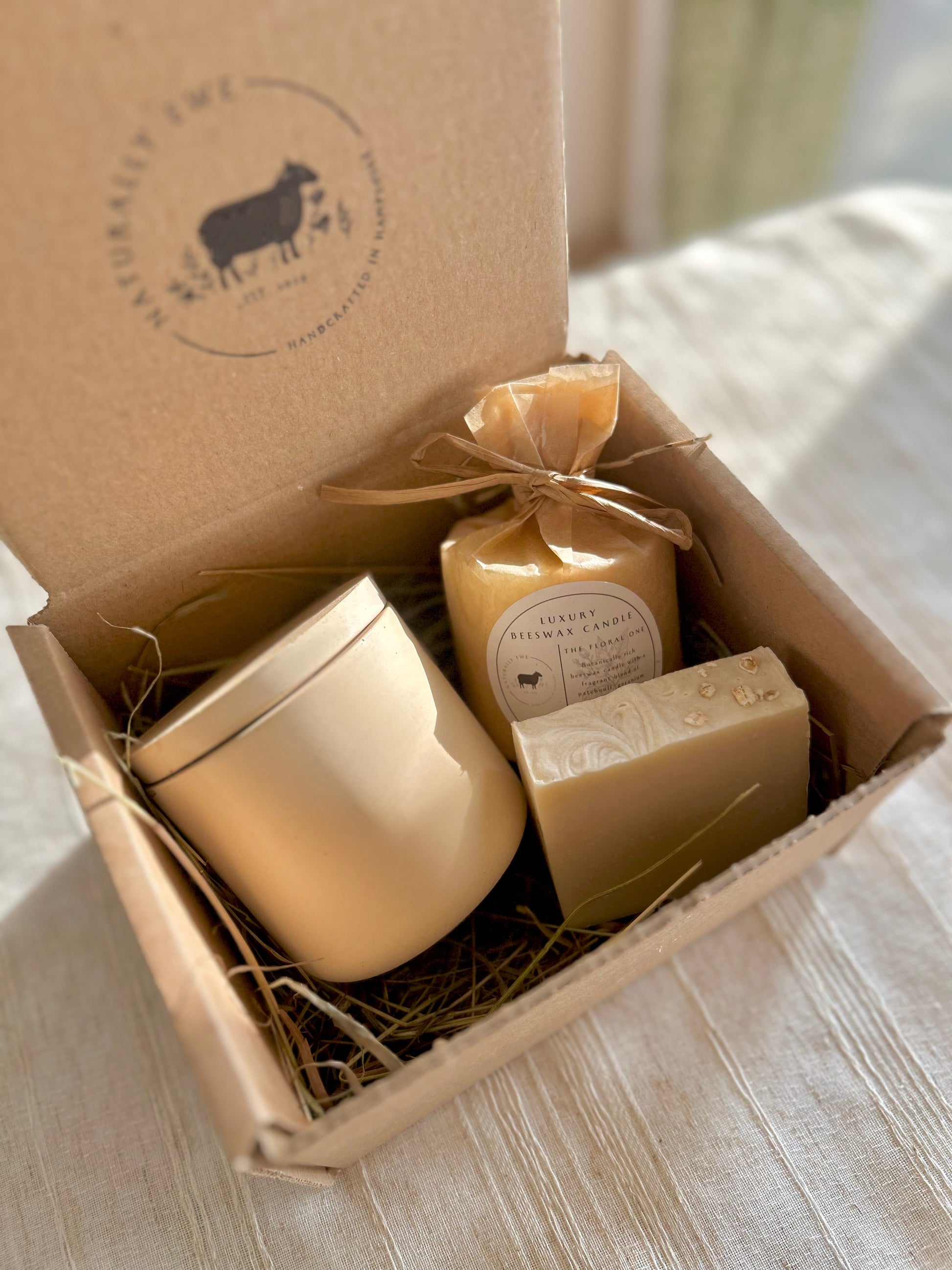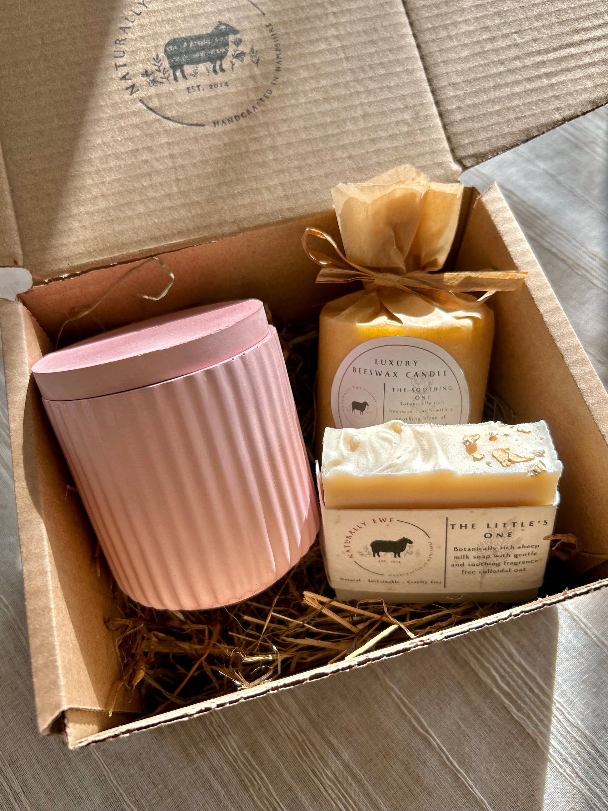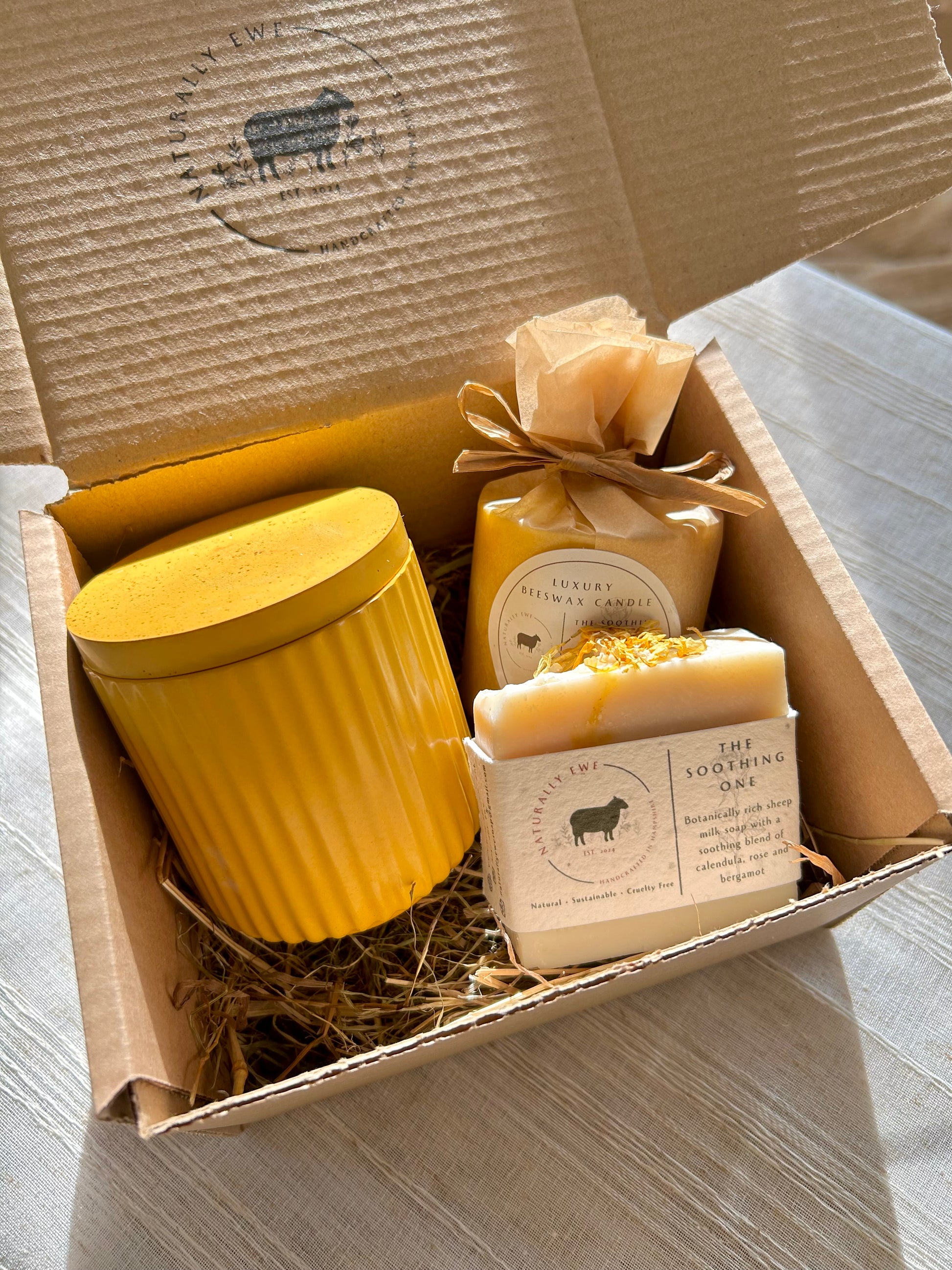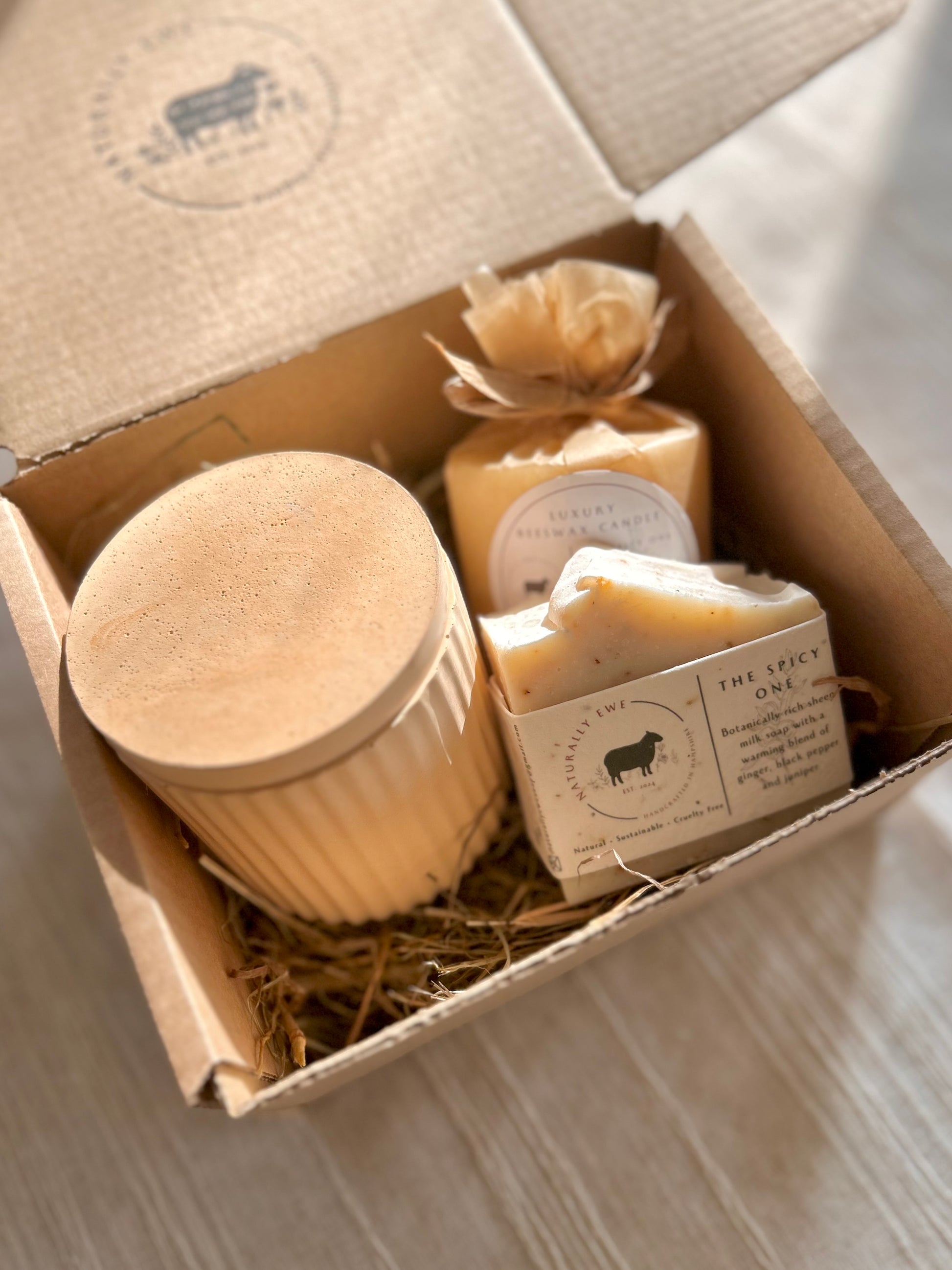 The perfect start up collection including 1 botanically rich sheep milk soap bar and 1 refillable beeswax candle in your chosen fragrance as well as a candle jar in your choice of colour.