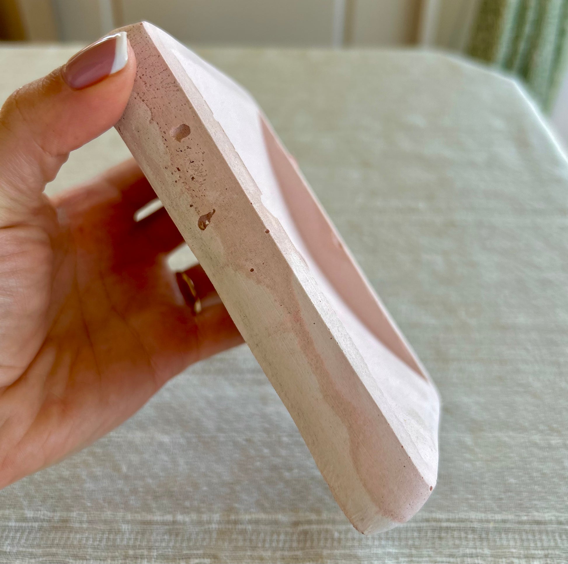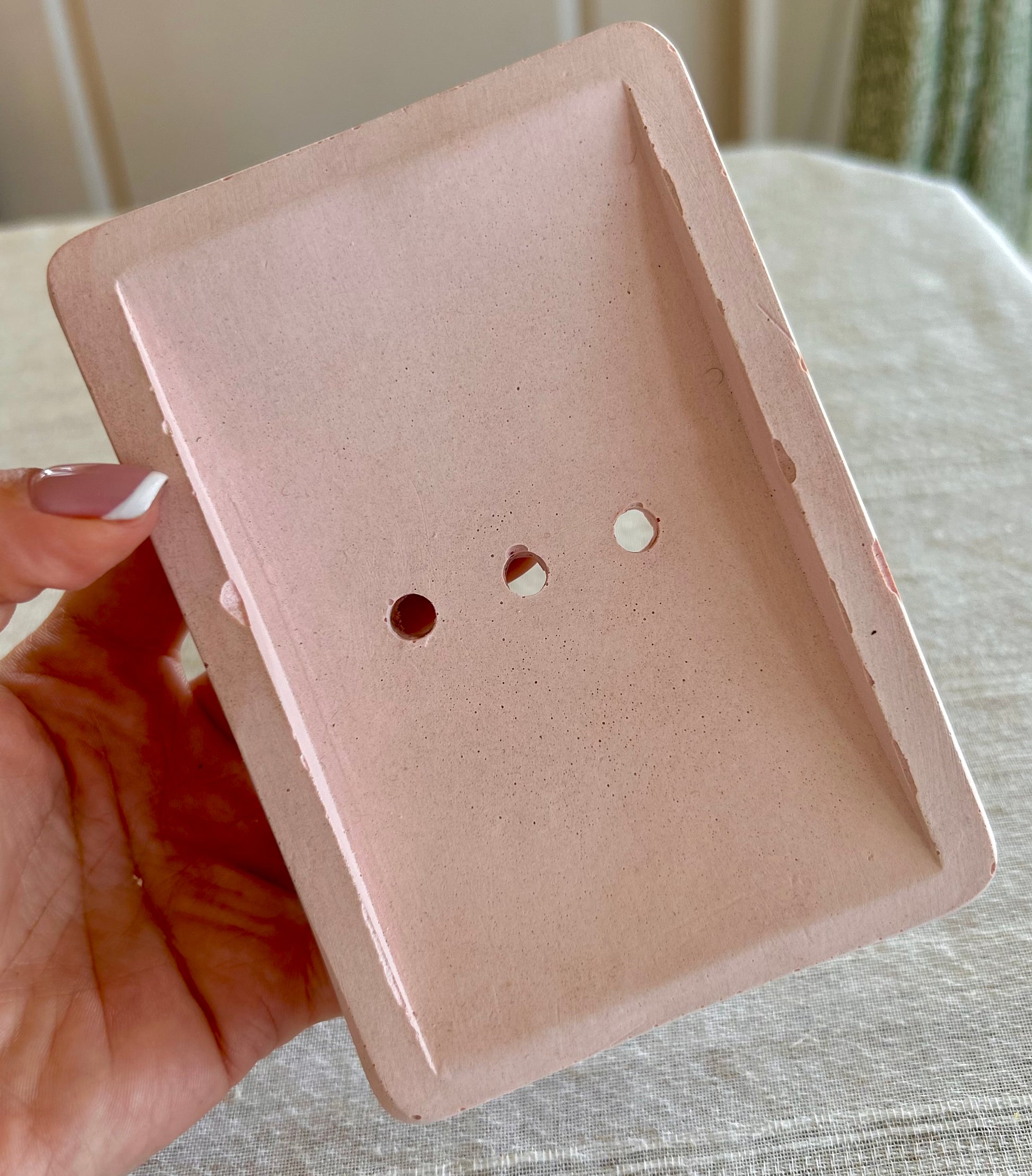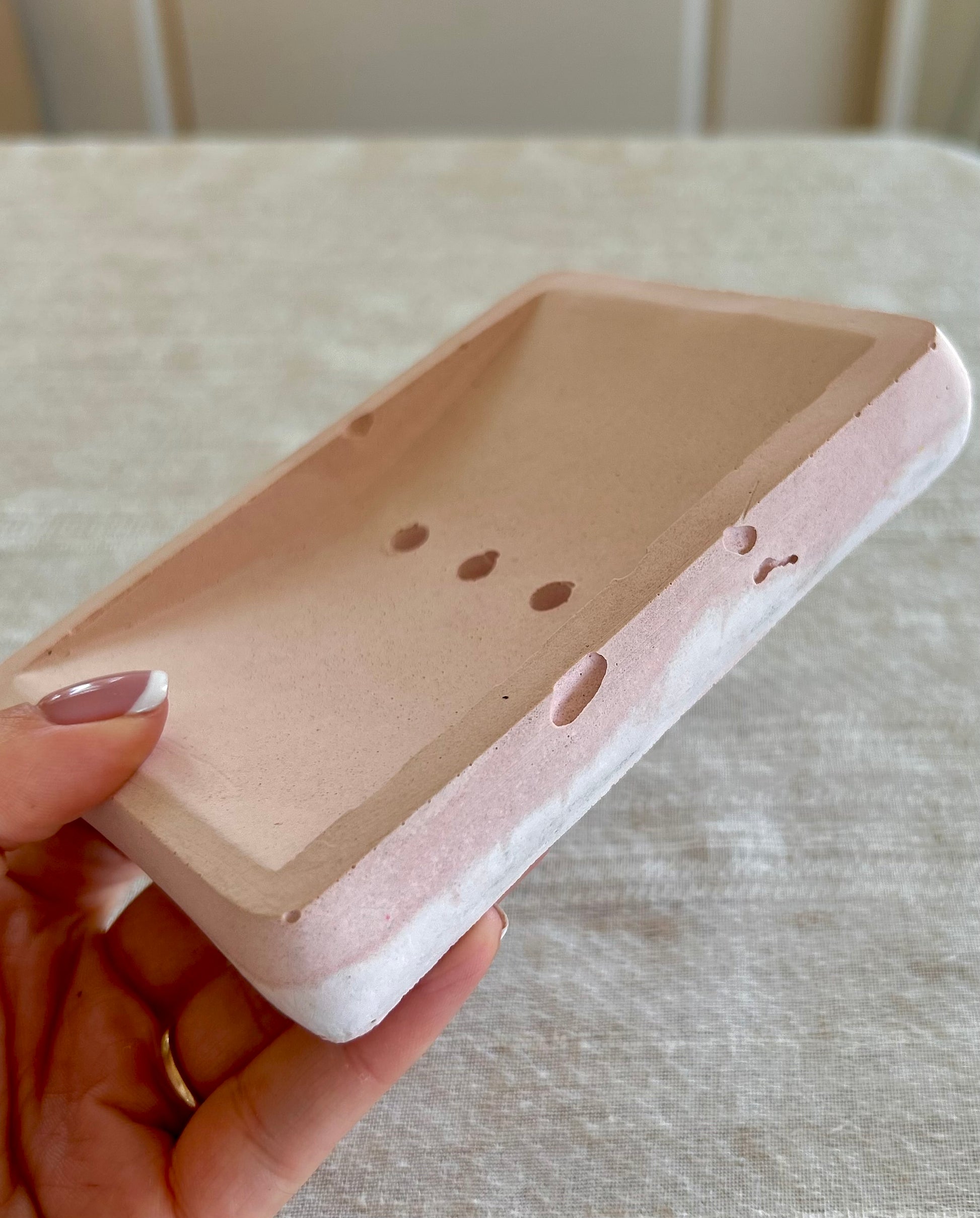 This soap tray in colour Blossom is paler in colour than the usual Blossom range. It also has a lighter bottom half and air bubbles along the edges. These imperfections do not affect the use of the soap dish.