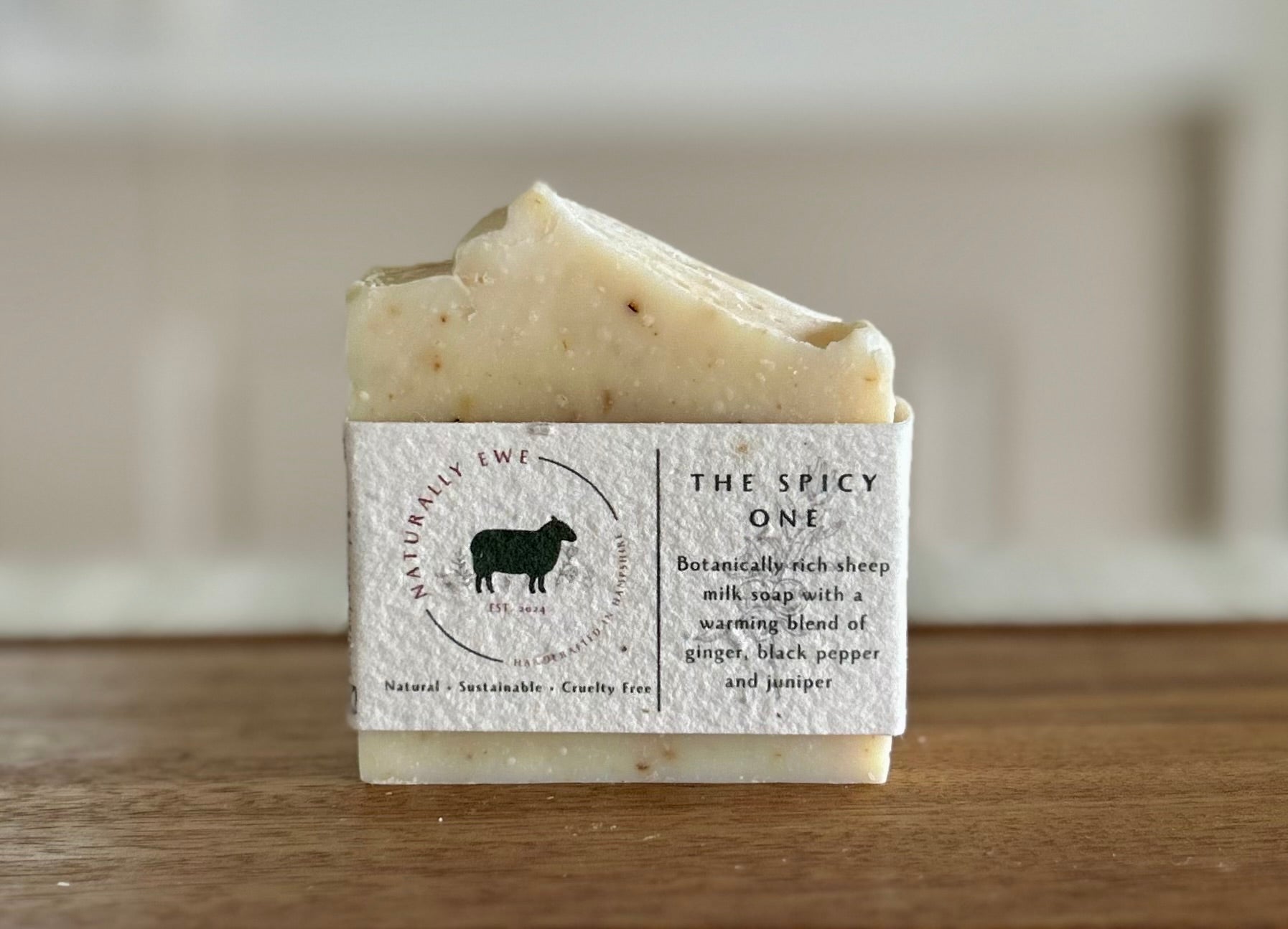 Botanically rich sheep milk soap with a warming blend of ginger, black pepper and juniper. ‘Naked’ version without the botanicals on top.