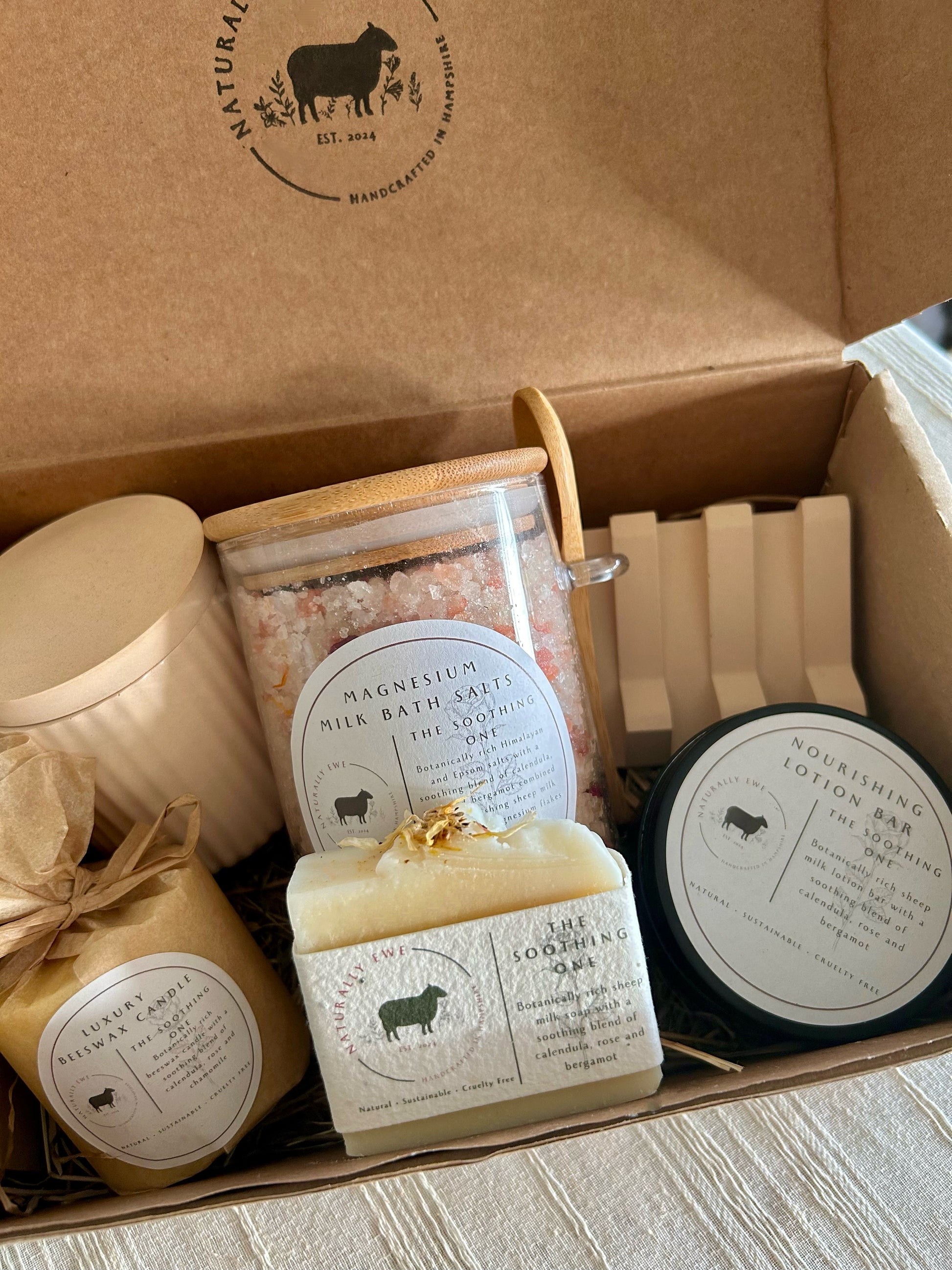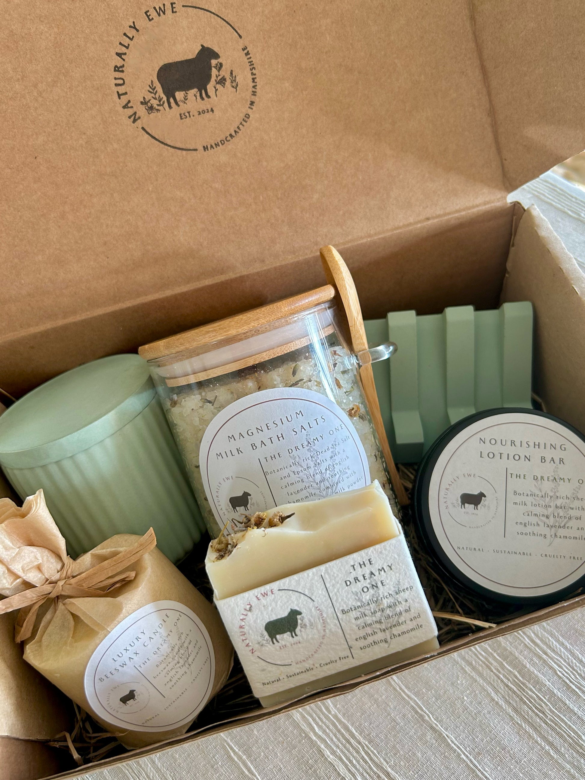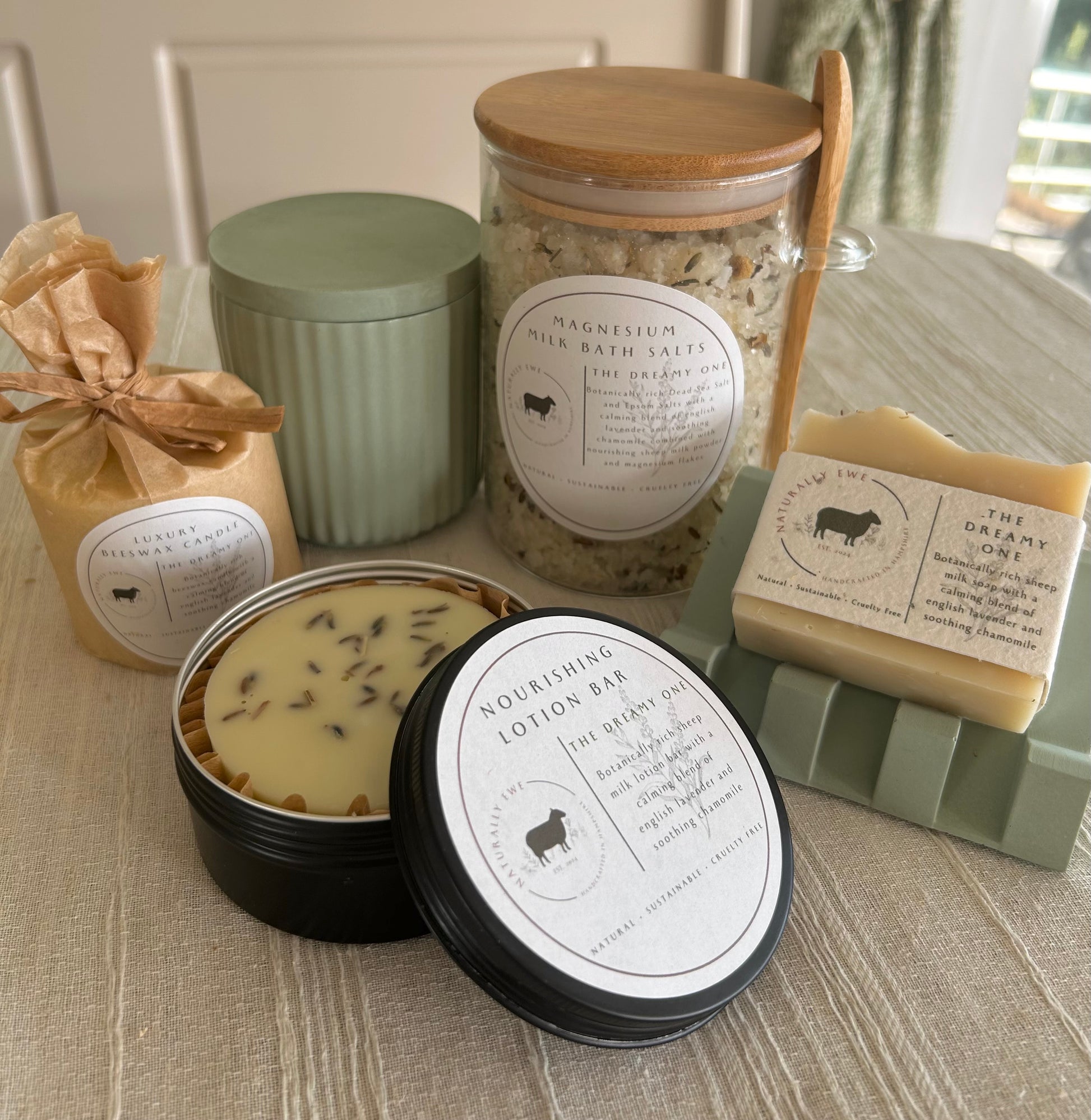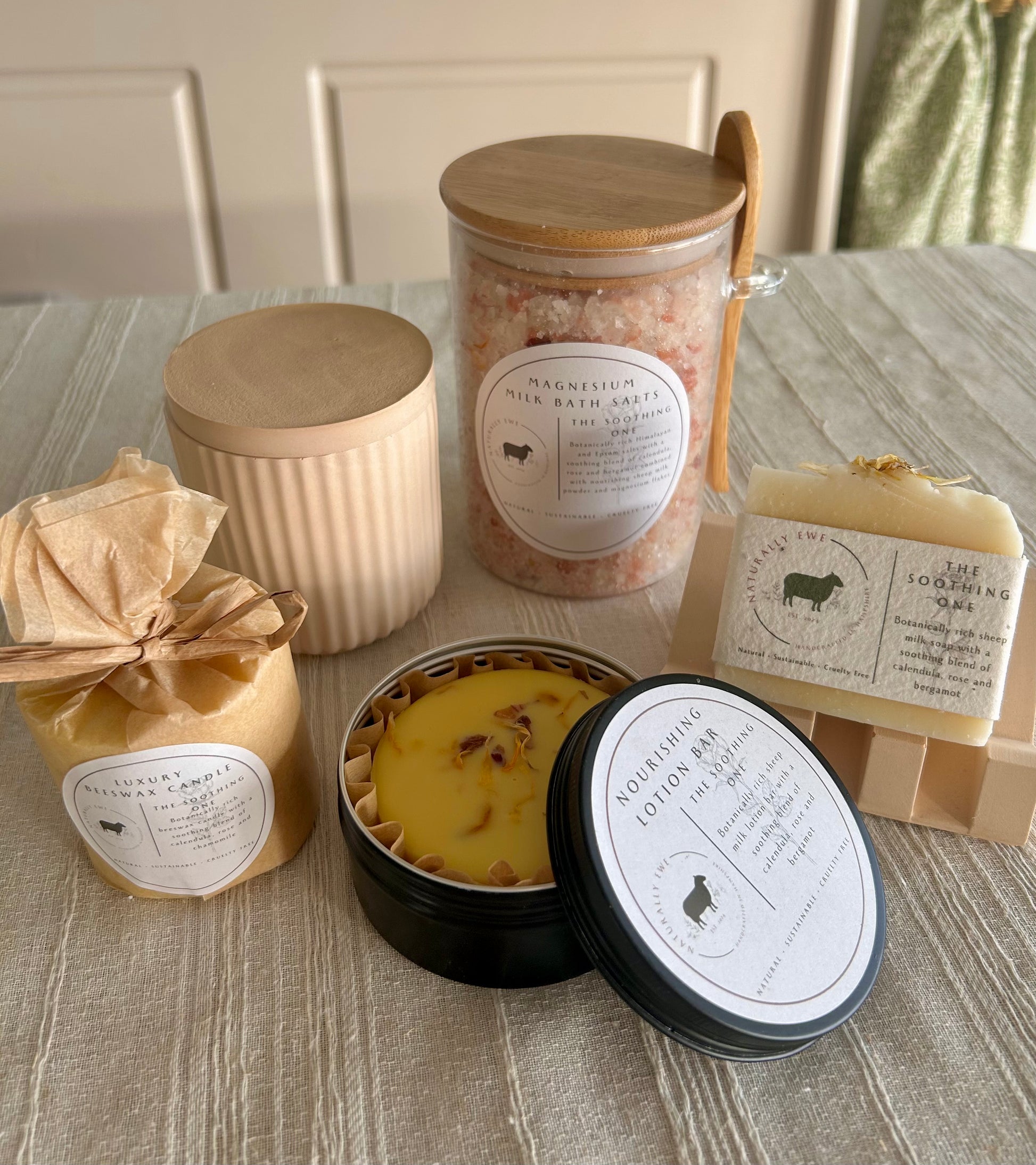 Treat yourself or someone special to the ultimate indulgence with a complete Naturally Ewe collection including 1 botanically rich sheep milk soap bar, 1 refillable beeswax candle, 1 large nourishing lotion bar and 1 jar of magnesium milk bath salts in your chosen fragrance as well as a candle jar and a soap stand in your choice of colour.