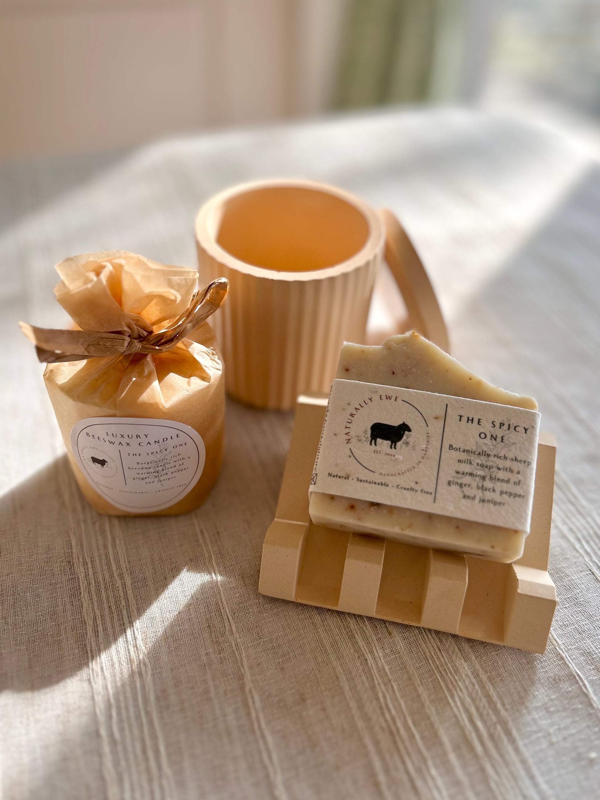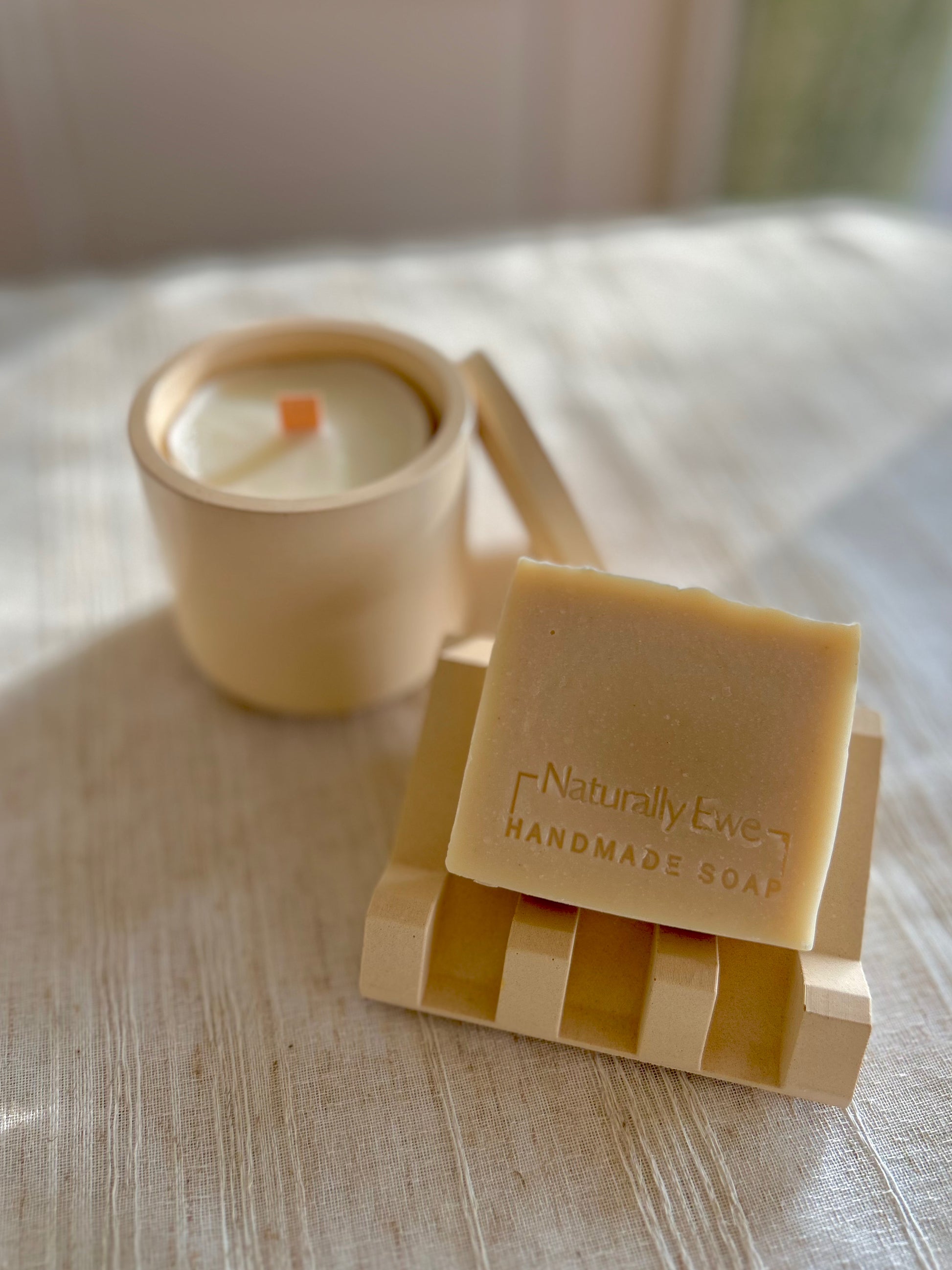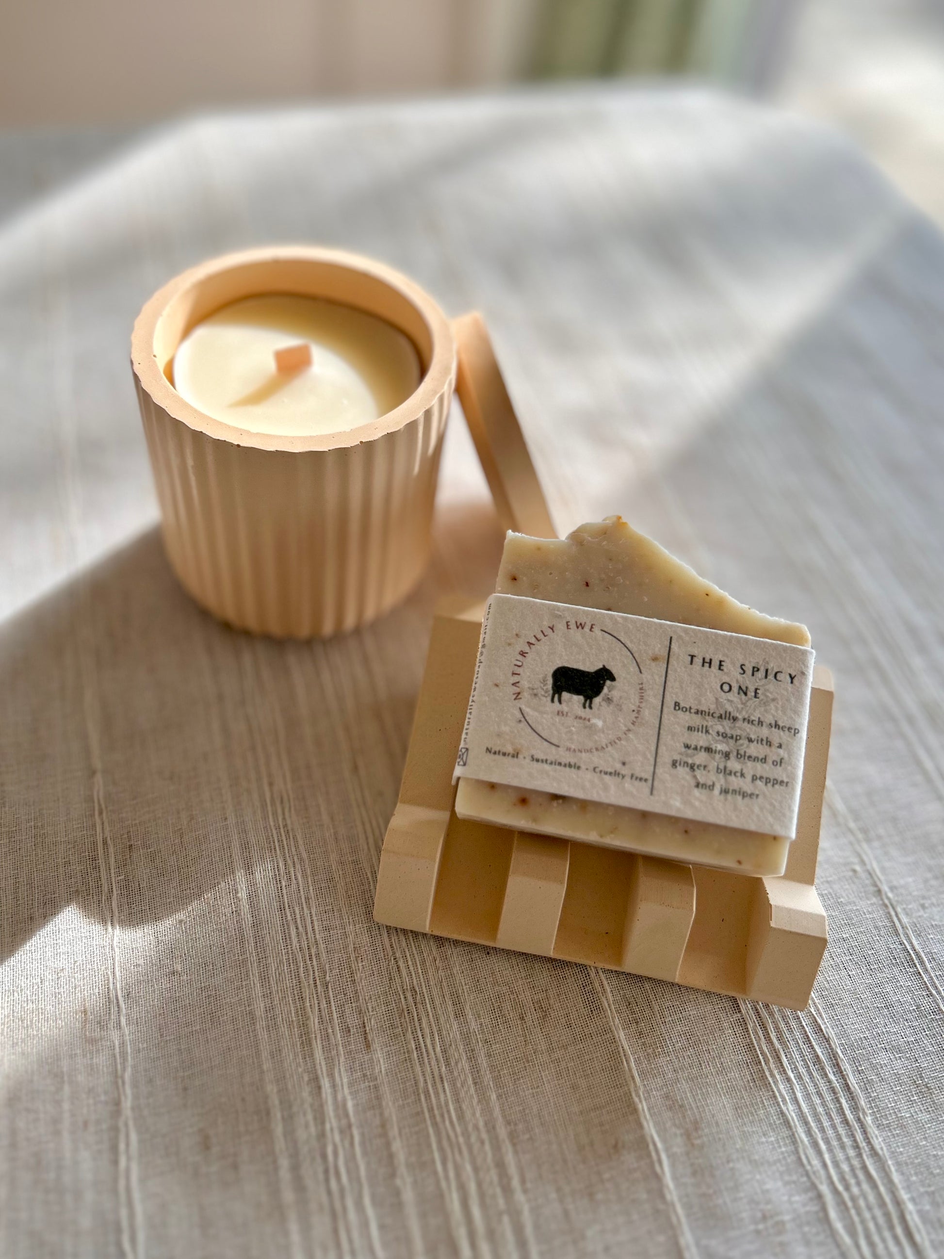 The candle jar and soap dish is made from Jesmonite which is an environmentally conscious alternative to traditional resin products. It is non toxic, contains no VOC’s and is safe to work with. Working in an environmentally conscious way is very important to Naturally Ewe – all of our packaging is recyclable or plantable as well as using all sustainable and environmentally friendly products and ingredients.