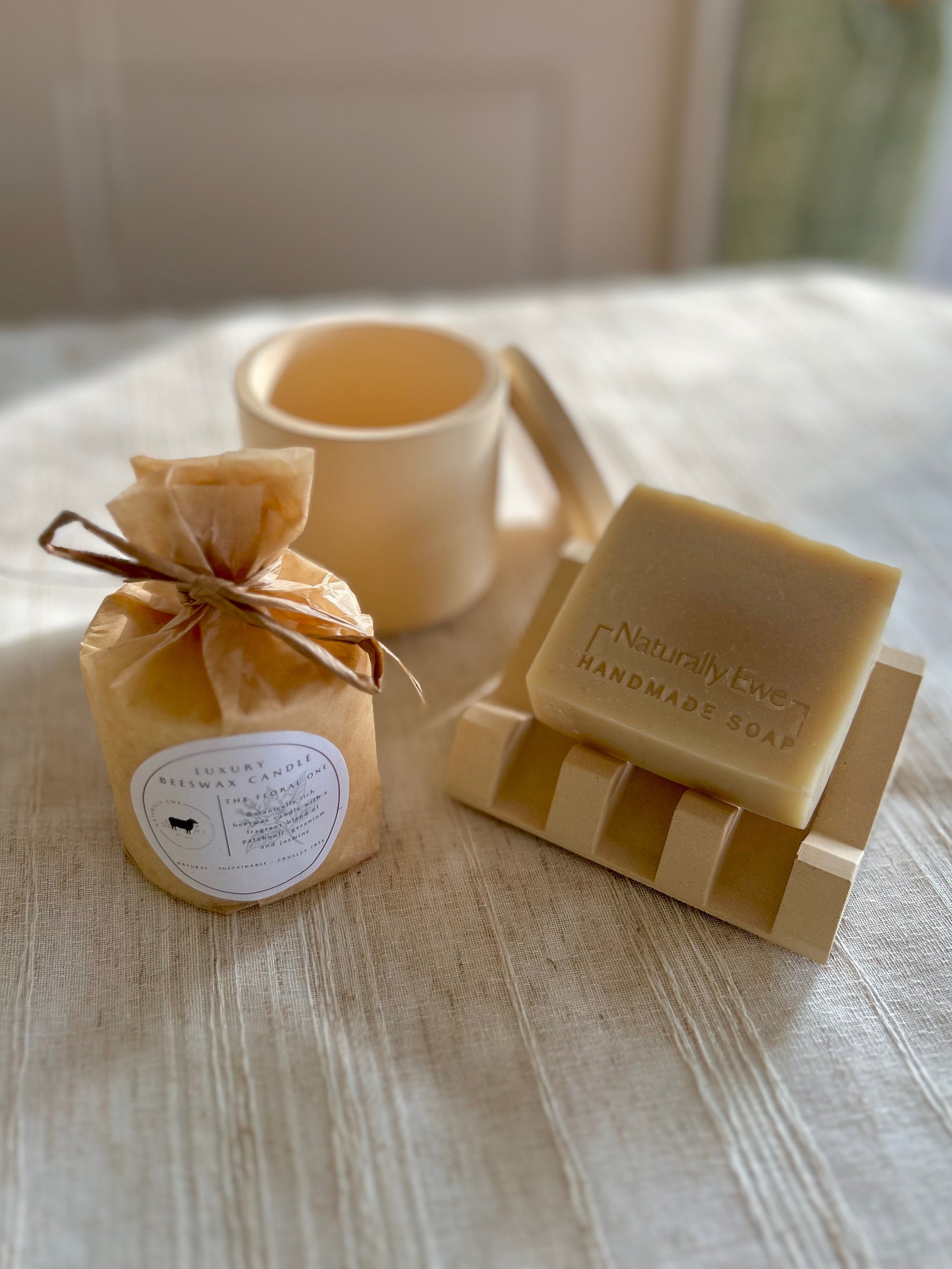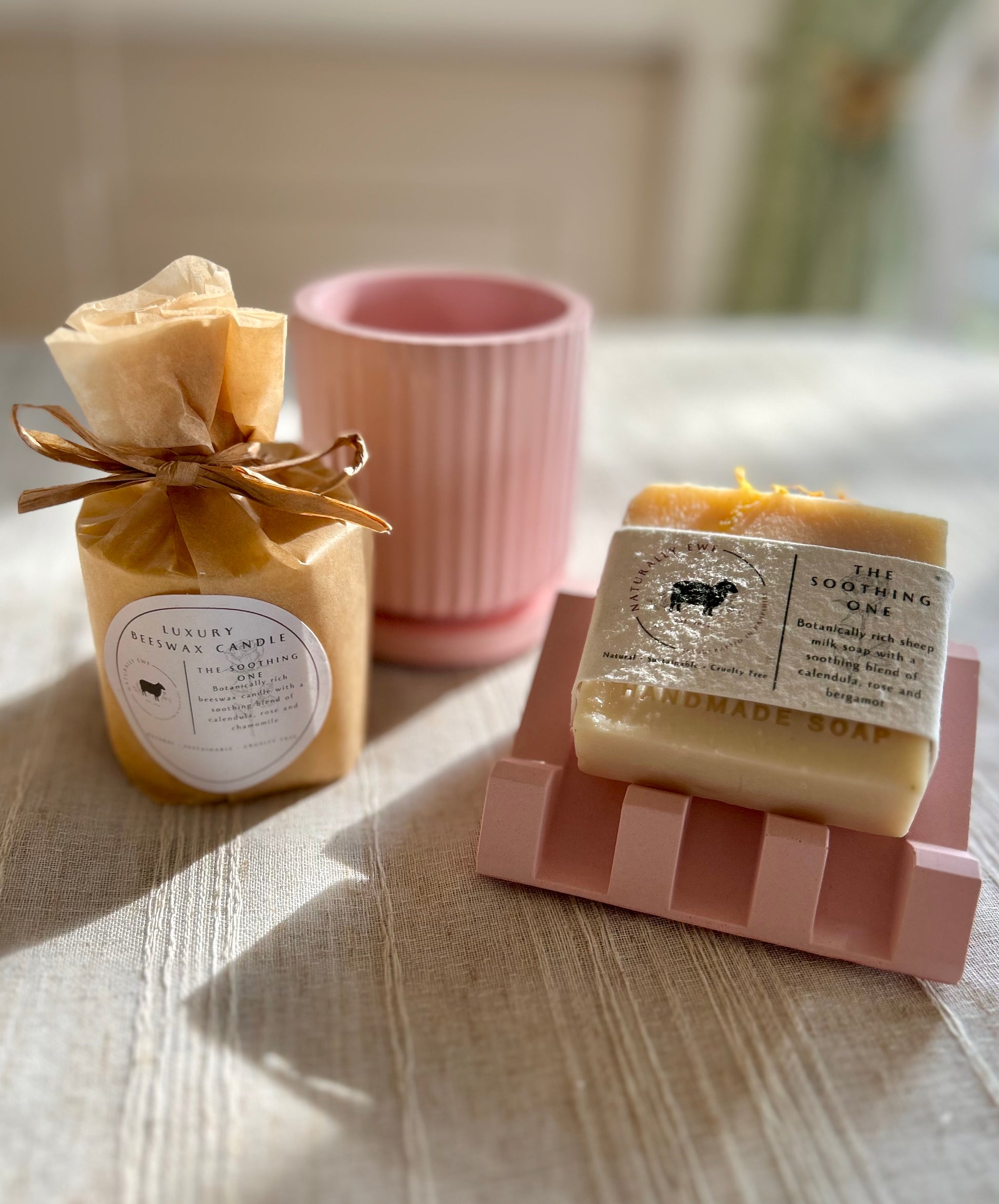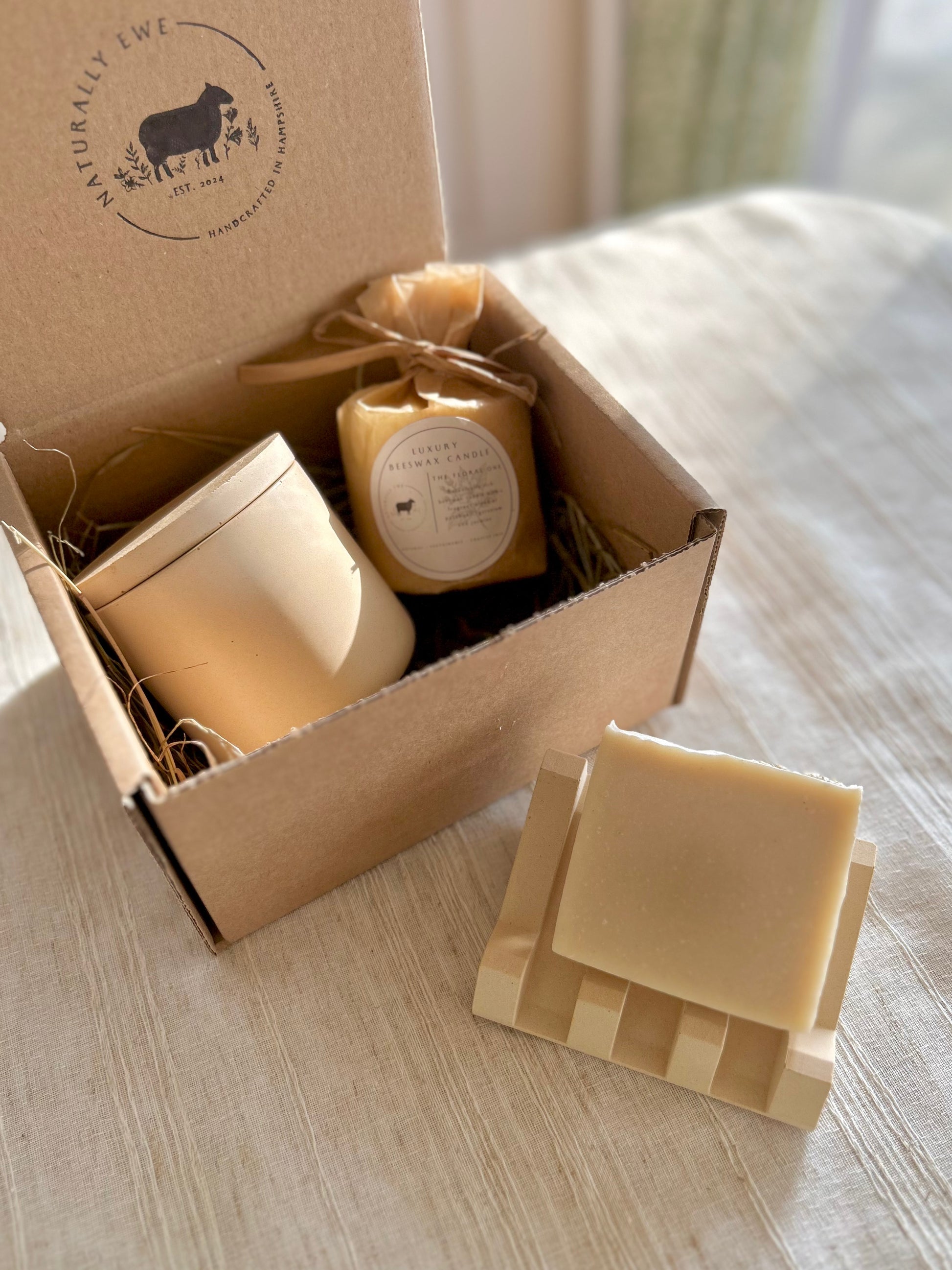 Unwind and relax with this gorgeous Naturally Ewe collection including 1 botanically rich sheep milk soap bar and 1 refillable beeswax candle in your chosen fragrance as well as a candle jar and a soap stand in your choice of colour.