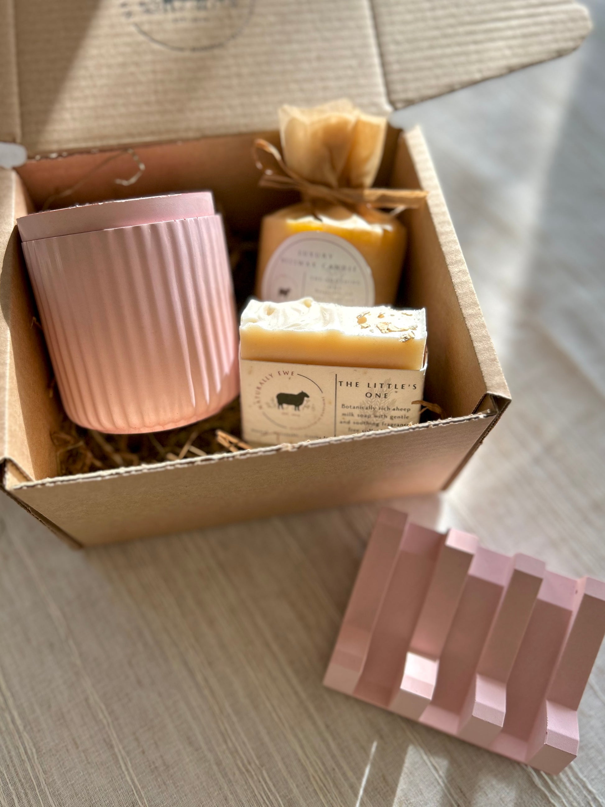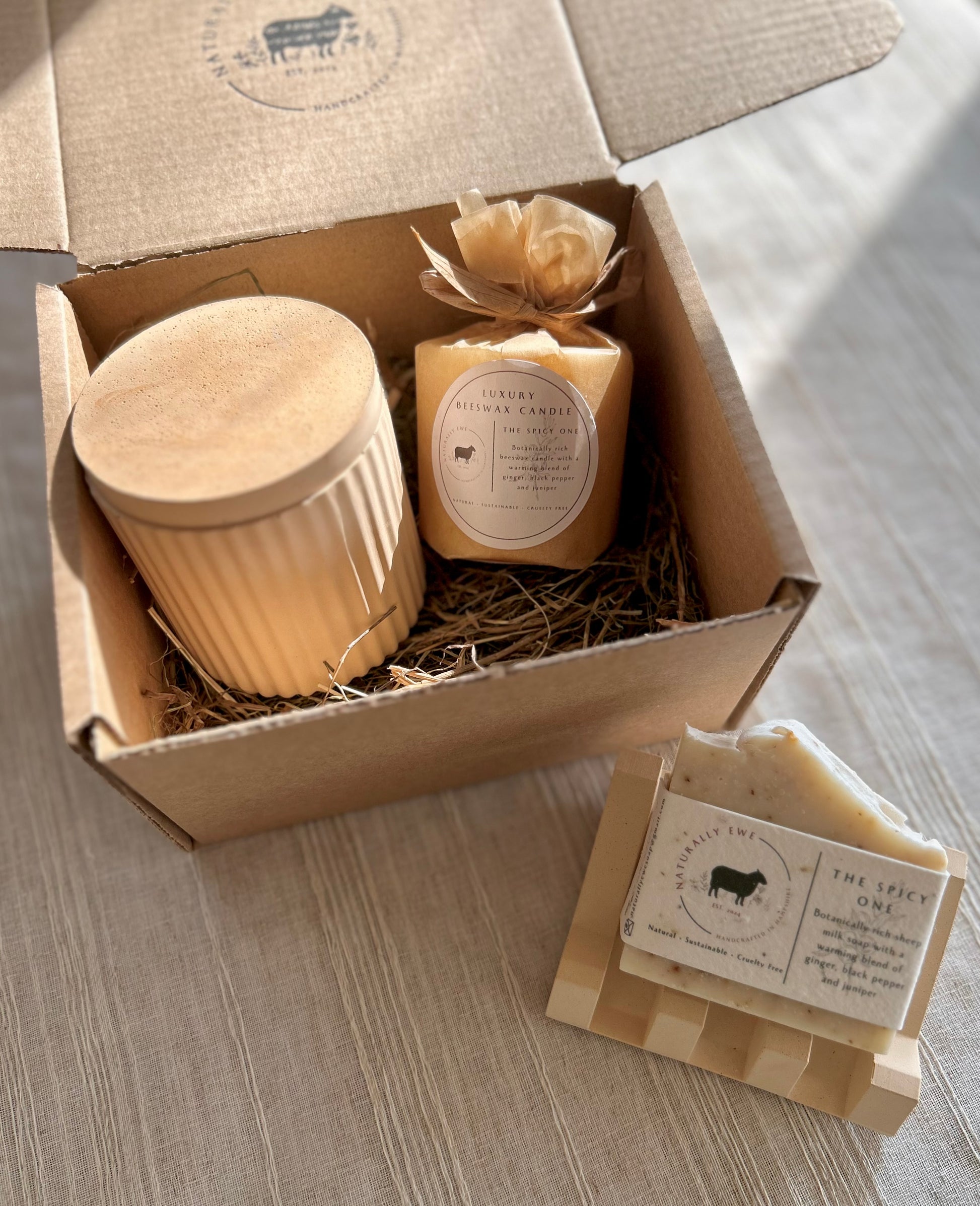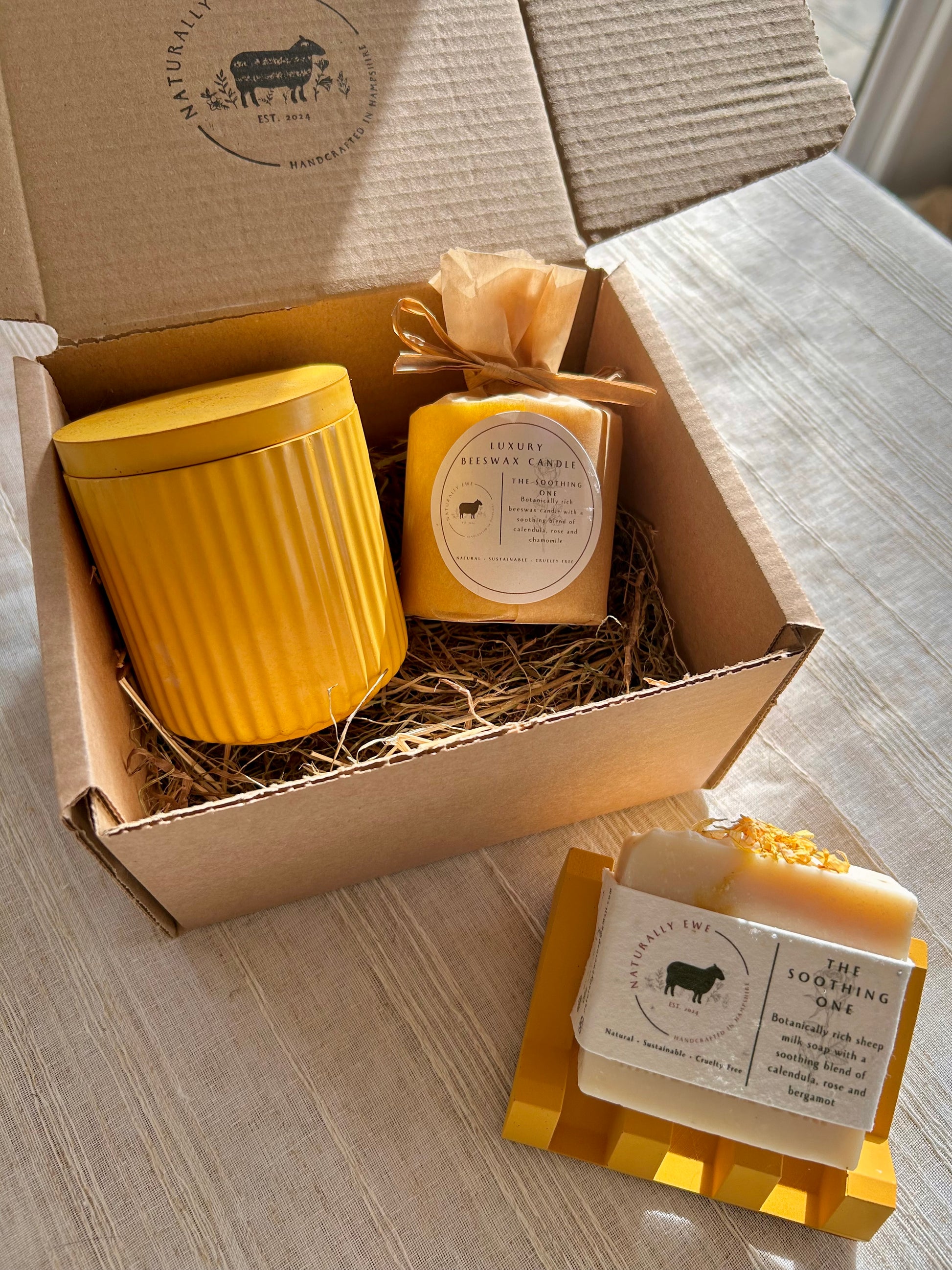 Unwind and relax with this gorgeous Naturally Ewe collection including 1 botanically rich sheep milk soap bar and 1 refillable beeswax candle in your chosen fragrance as well as a candle jar and a soap stand in your choice of colour.